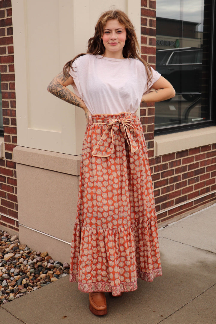 The Addison Skirt features an elastic waistband with attached belt and contrasting trim on the hem.