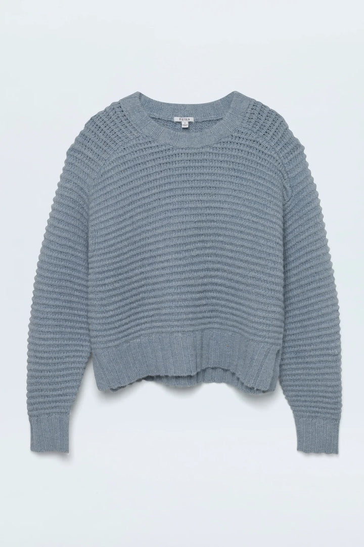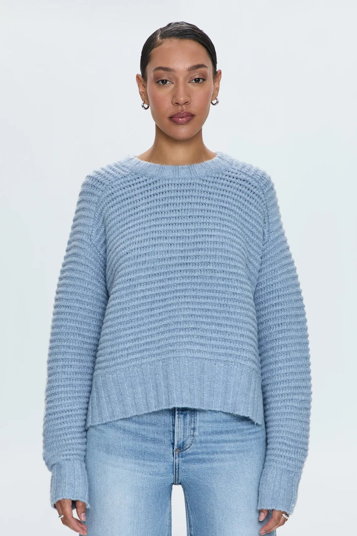 Introducing our Adina Ribbed Sweater in Soft Mist Blue. This medium weight, waffle knit sweater features raglan, long sleeves with monochromatic rib trim for a timeless, elegant look. The elongated crop proportion and split hem add a touch of modernity, creating a flattering silhouette that grazes the waistband. Offered in a soft, light blue hue, this sweater is a perfect addition to your winter wardrobe.