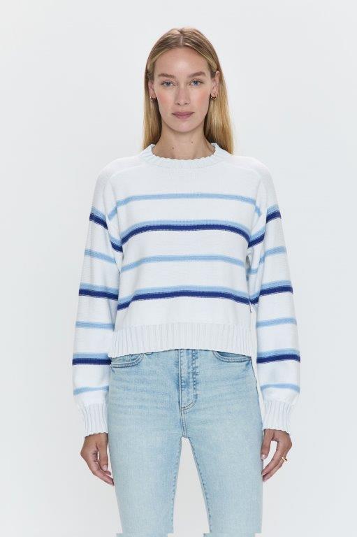 The Adina sweater is a medium wright, waffle knit sweater that features raglan sleeves with ribbing at the neckline, sleeves, and hem. The Adina is designed with an elongated crop and split hem that grazes the waistband. We are loving the stripes this season.