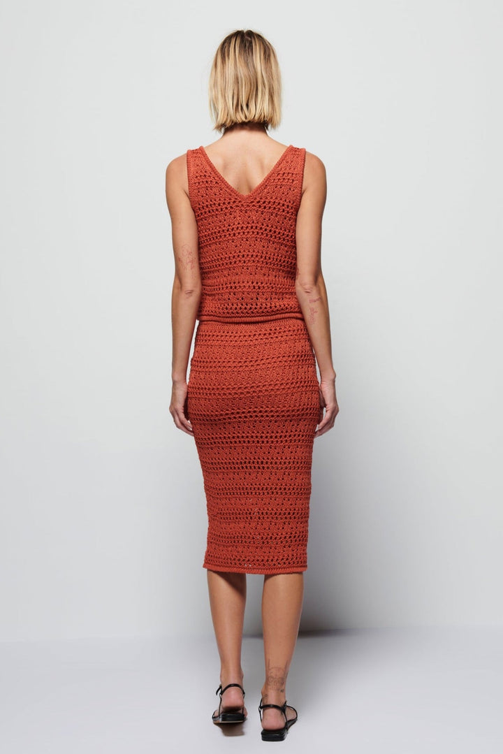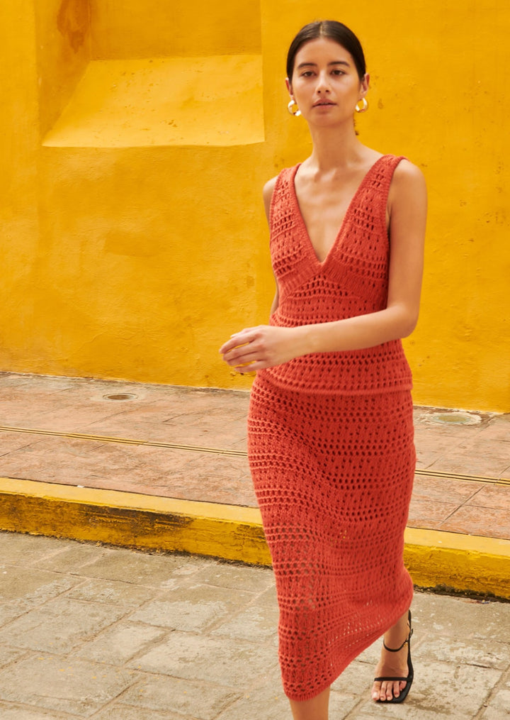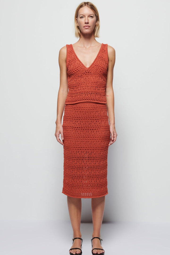 The Adriana Crochet Tank in a vibrant ginger hue is a versatile and stylish addition to your wardrobe. Its beautiful crochet knit design, v-neck cut, and light lining make it perfect for any occasion. Pair with denim for a casual look, or with the matching crochet skirt for a chic and coordinated outfit.