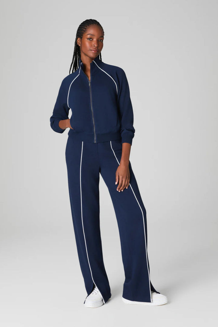 Introducing the Air Essentials Pique Full Zip Track Jacket in navy. Made with SPANX®'s breathable AirEssentials fabric, this jacket features front pockets, a full-length zipper, and distinctive striped details for a sporty look. With 4-way stretch, it's perfect for any activity. Get yours today for comfort all day long.