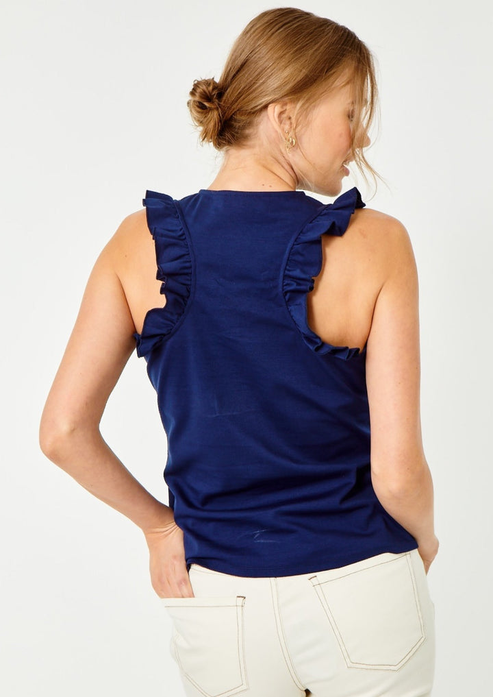 Introducing the Alice Tank in Ocean Cavern! With flirty ruffle accents and a relaxed fit, this racerback tank is both comfortable and stylish. Made of a cotton blend for a soft feel, and in a bright navy hue, this elevated basic can be dressed up or down for any occasion.