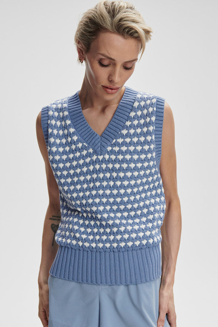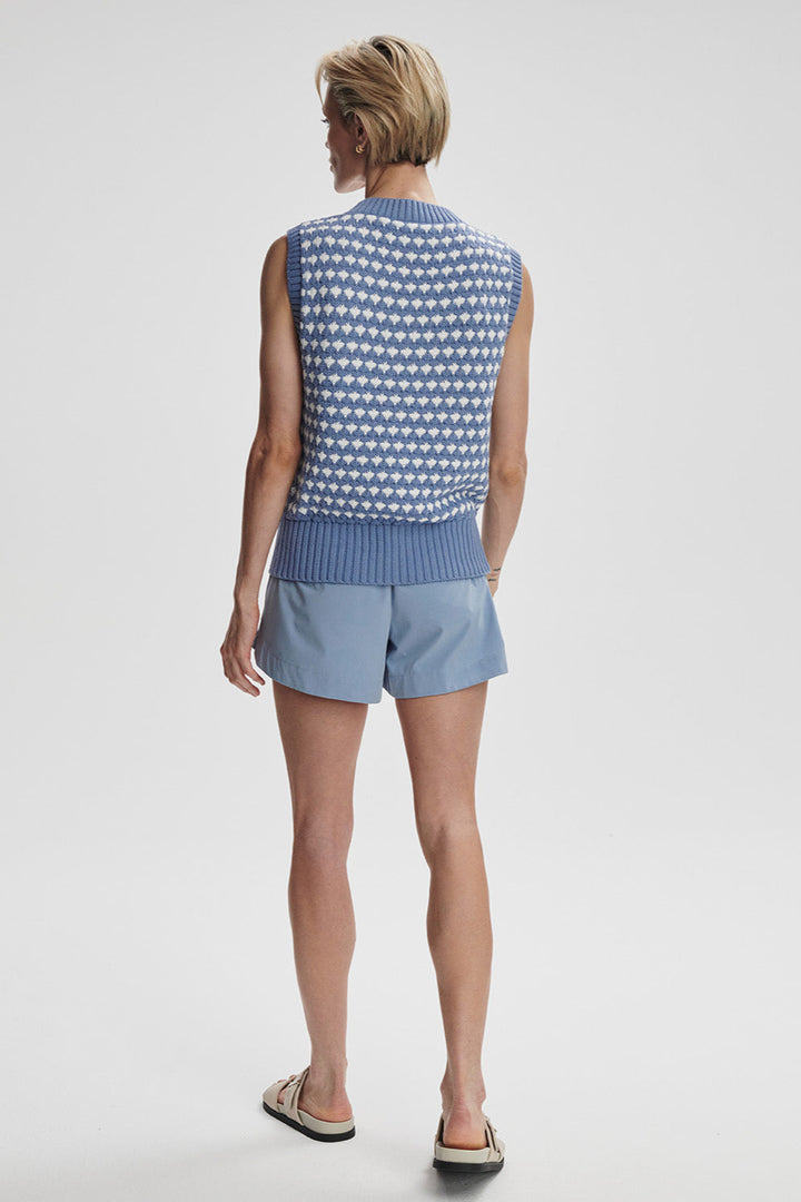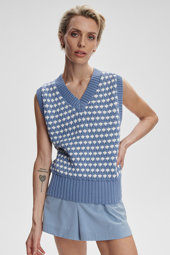 Expertly crafted from a cotton poly tube yarn in a two-color stitch, the Antonella knit vest is a soft and versatile layering piece. With a V-neckline and a relaxed yet flattering fit, it is perfect for adding a touch of comfort and style to any outfit.