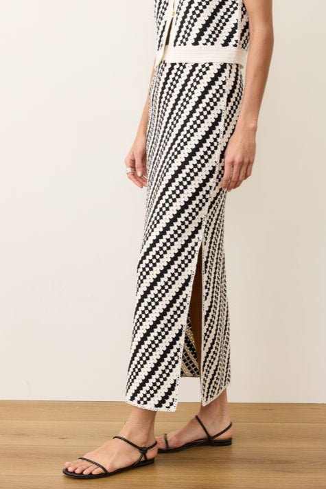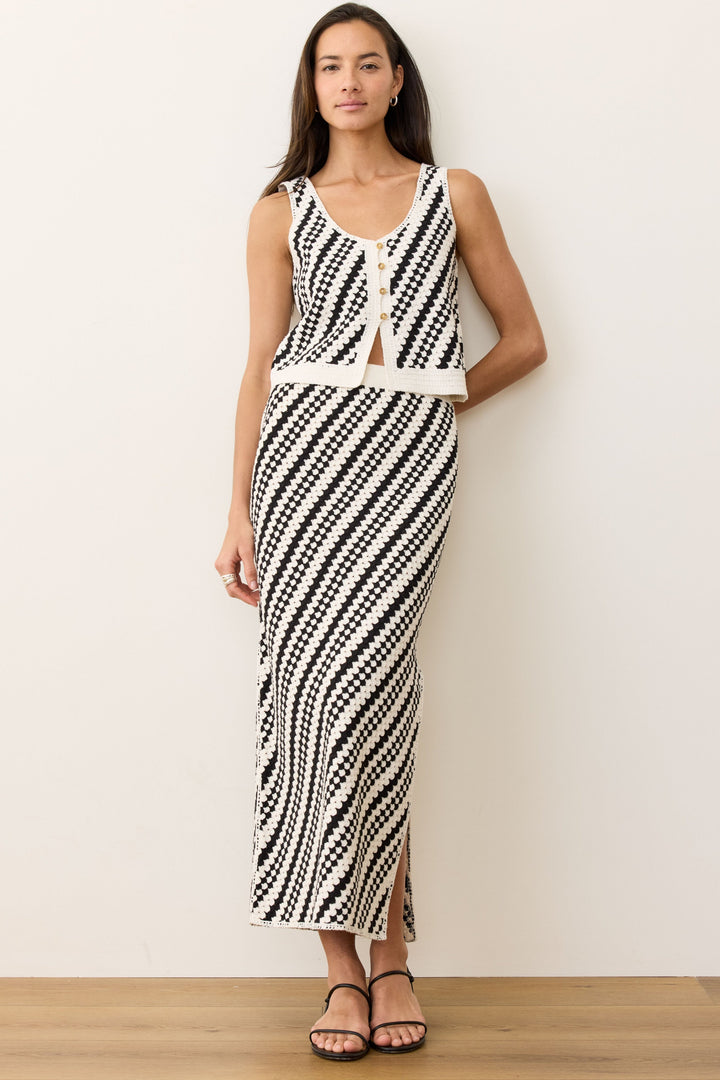 The Sands Sweater Skirt in Cream/Black Stripe features a flattering column silhouette that elegantly skims your body without restriction. Its distinctive diagonal crochet stitch adds sophisticated texture and visual interest, while the knit elastic waistband ensures all-day comfort. This versatile maxi design offers polished style with practical wearability—complete the coordinated look with the matching tank for a refined ensemble.