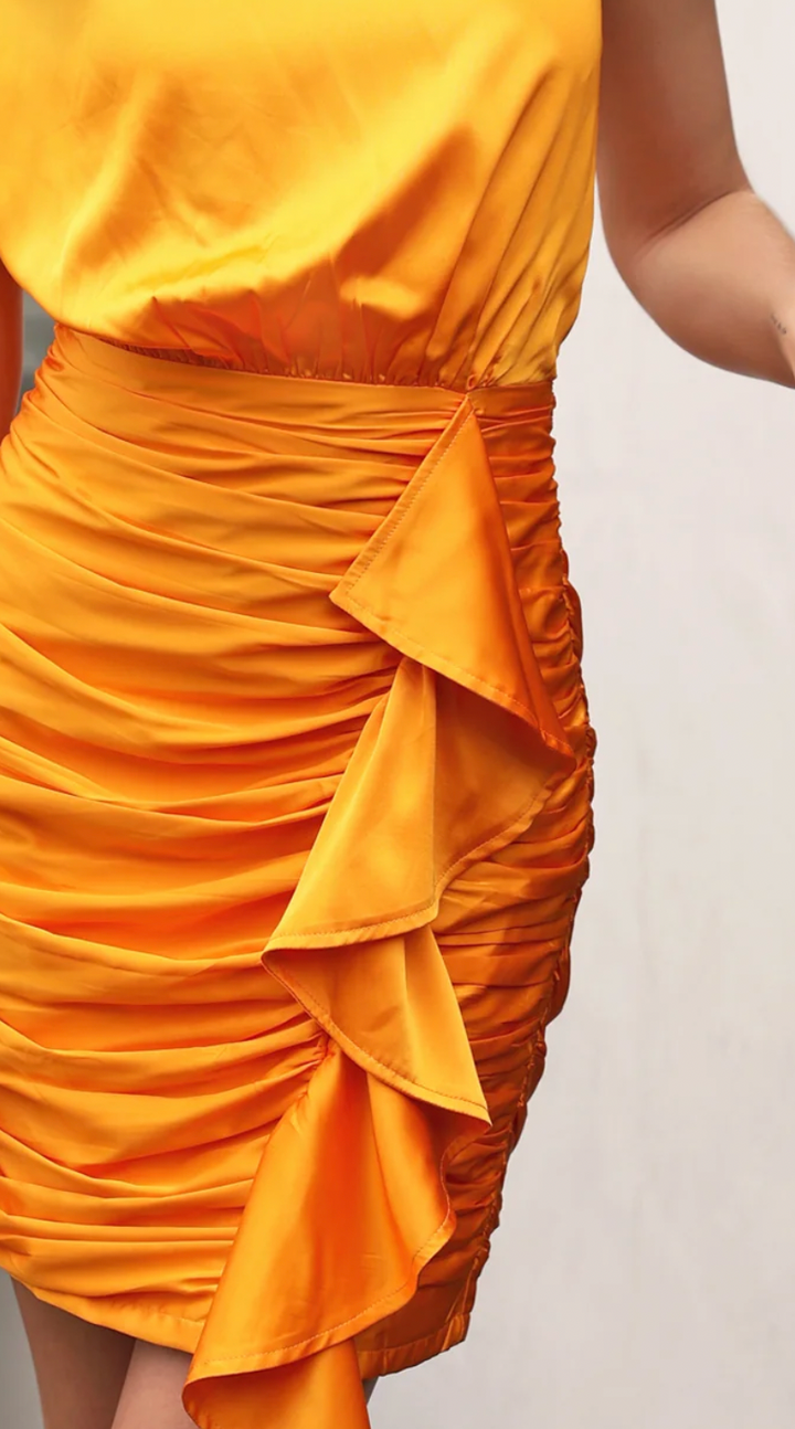 Made from a light, silky material this dress has the right amount of stretch to be both figure flattering and move with you. The skirt is completely gathered with a draped ruffle down the front. The perfect dress for your next cocktail party or wedding.