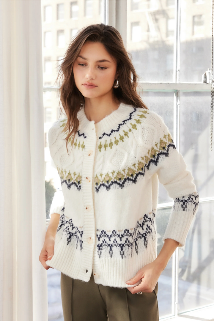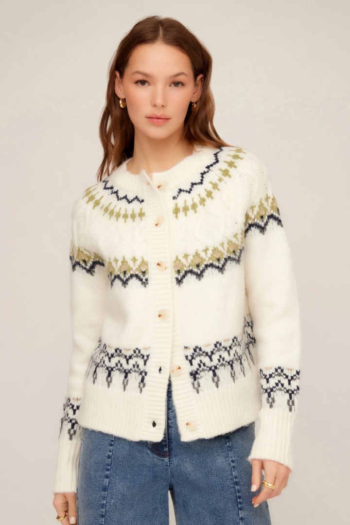 Cozy up in the Astrid Cardigan Sweater, where timeless Fair Isle charm meets soft, midweight warmth without the itch. With long sleeves, wide-edge ribbing, and a playful button-front design, this classic fit sweater brings a dash of heritage-inspired style to your everyday wardrobe. Perfect for layering or wearing solo, it’s your new go-to for comfy, cheerful cool days.