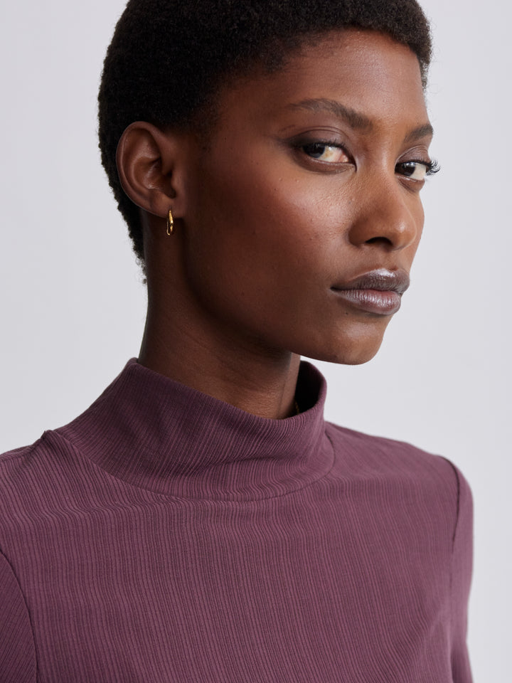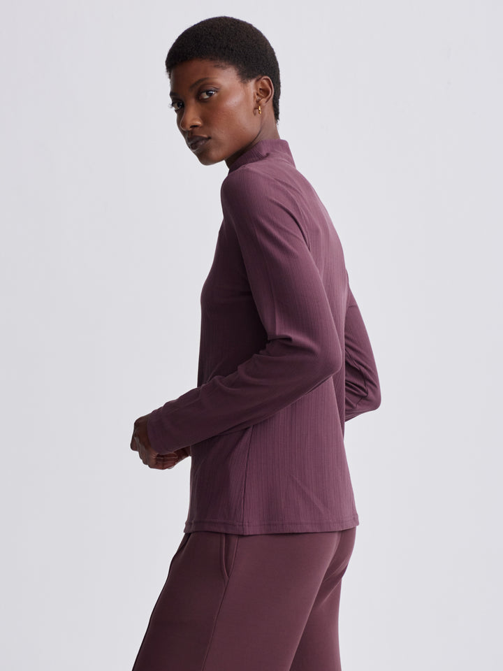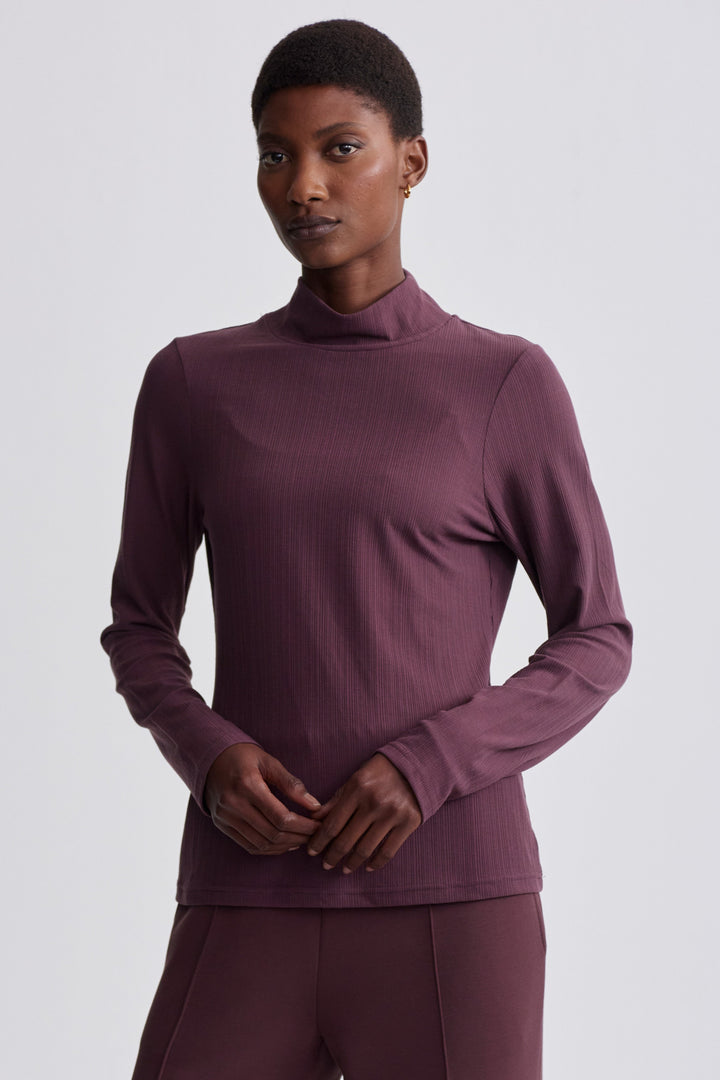 Introducing the Astrid Fitted Long Sleeve Top in Huckleberry. Made from our Variegated Rib fabric, this top offers modern style and stretchable comfort. With a flattering fit, mock neck, and straight hem, it's perfect for layering or wearing alone. Stay effortlessly chic in any setting.