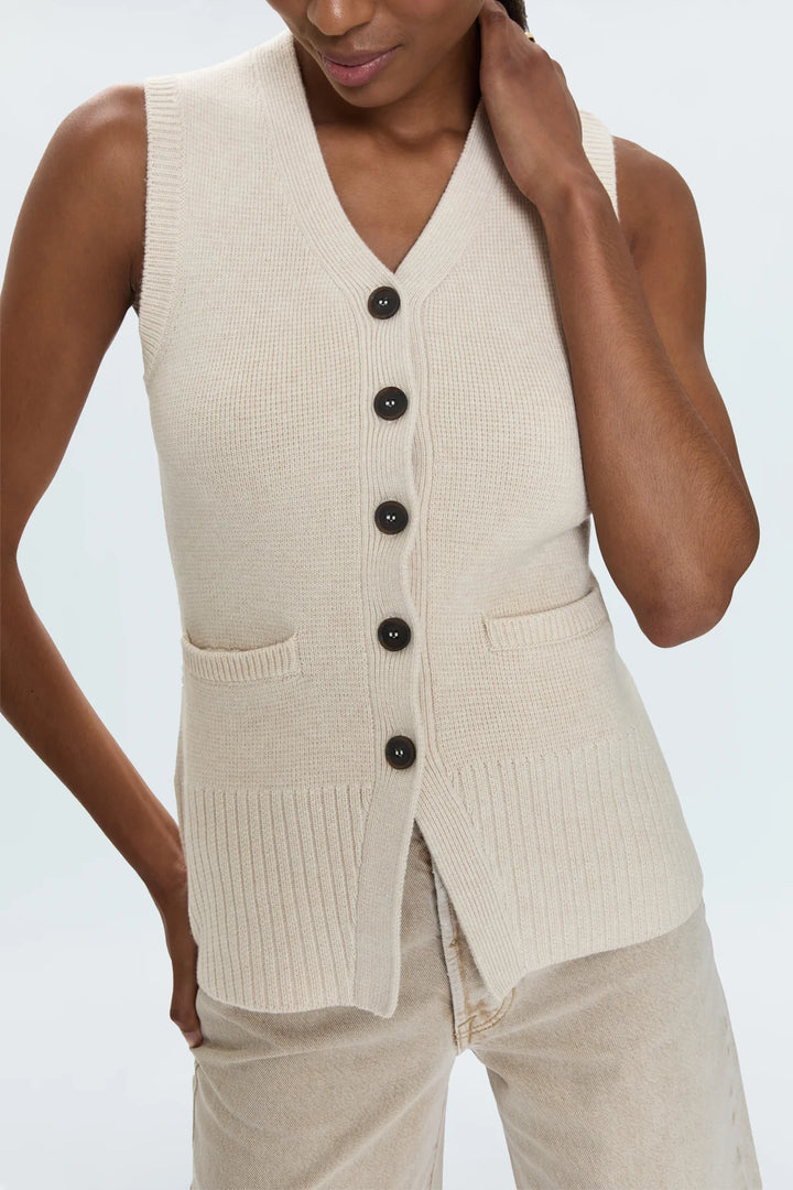 The sweater vest you didn't know you needed—the Audra vest from Pistola. The silhouette is a slim fit with center front button details, high v-neckline, splayed hem, all knit in a soft ecru yarn.