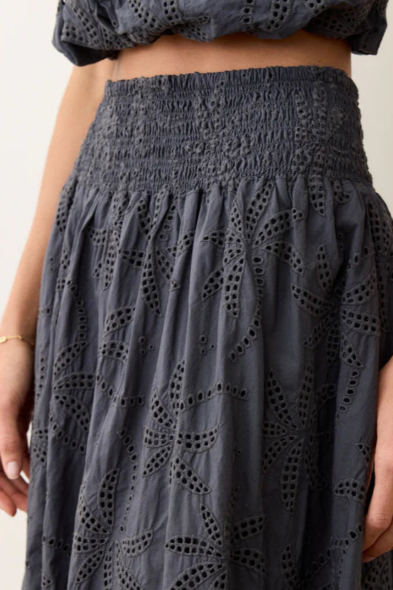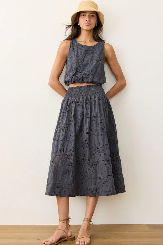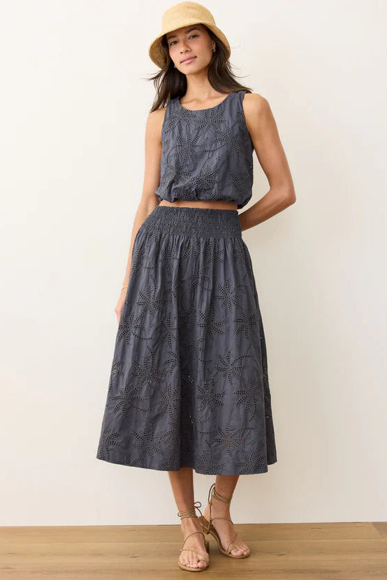 This midi skirt features smocking at the waist for a comfy, high-rise fit that moves with you. Crafted from soft poplin with a charming custom eyelet design, it’s the perfect blend of playful and easygoing. Get ready to fall in love with your new favorite go-to!