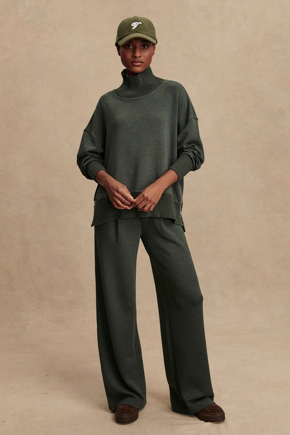 Get cozy in the Barker High Neck DoubleSoft Sweatshirt! Featuring an oversized fit and a trendy high-neck design, this olive marl favorite is as comfy as it is stylish. Knit cuffs, neck, and hem give it a polished touch, while deep side splits let you move freely and show off your playful side. Perfect for lounging or layering up with flair!