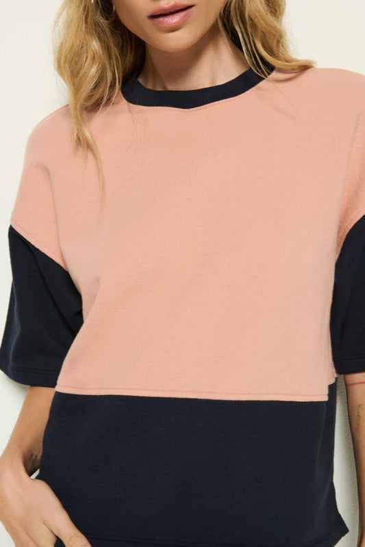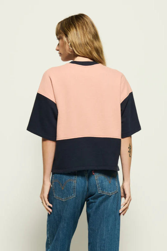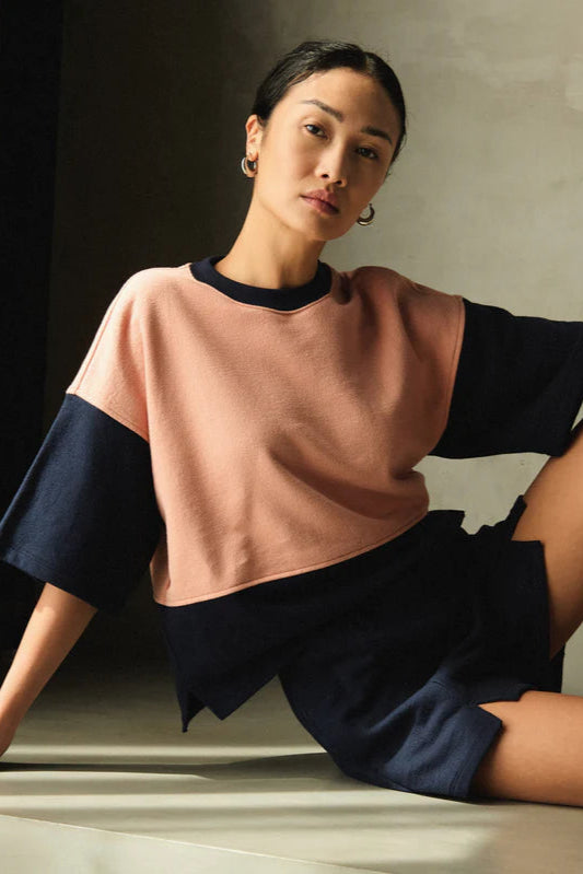 The Barrett Sweatshirt is the perfect combination of style and comfort. Made with Pima Cotton, its color blocked design adds a touch of uniqueness to the classic sweatshirt. The boxy and cropped silhouette is complemented by slits at the hips for added ease and movement. Available in Navy Night Sky Color Block.
