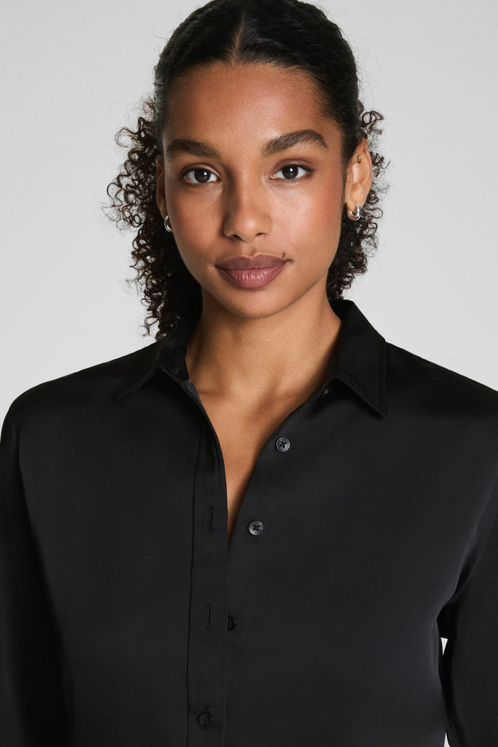 Feel effortlessly chic from the office to weekend adventures in the Better Than Silk Button-Down in Black. Its silky-smooth feel drapes beautifully while being totally machine washable for easy care. With a timeless design, this shirt effortlessly blends comfort and style, making it your go-to wardrobe hero for any occasion.