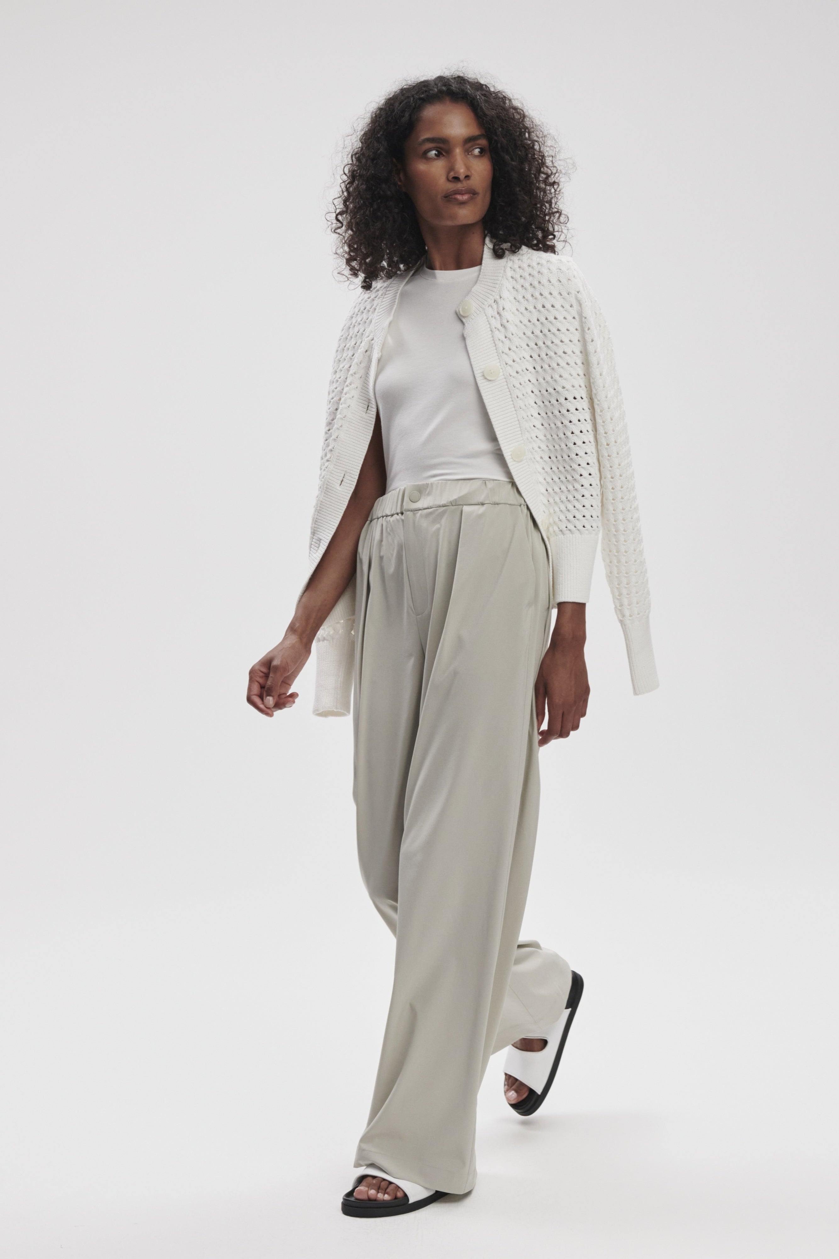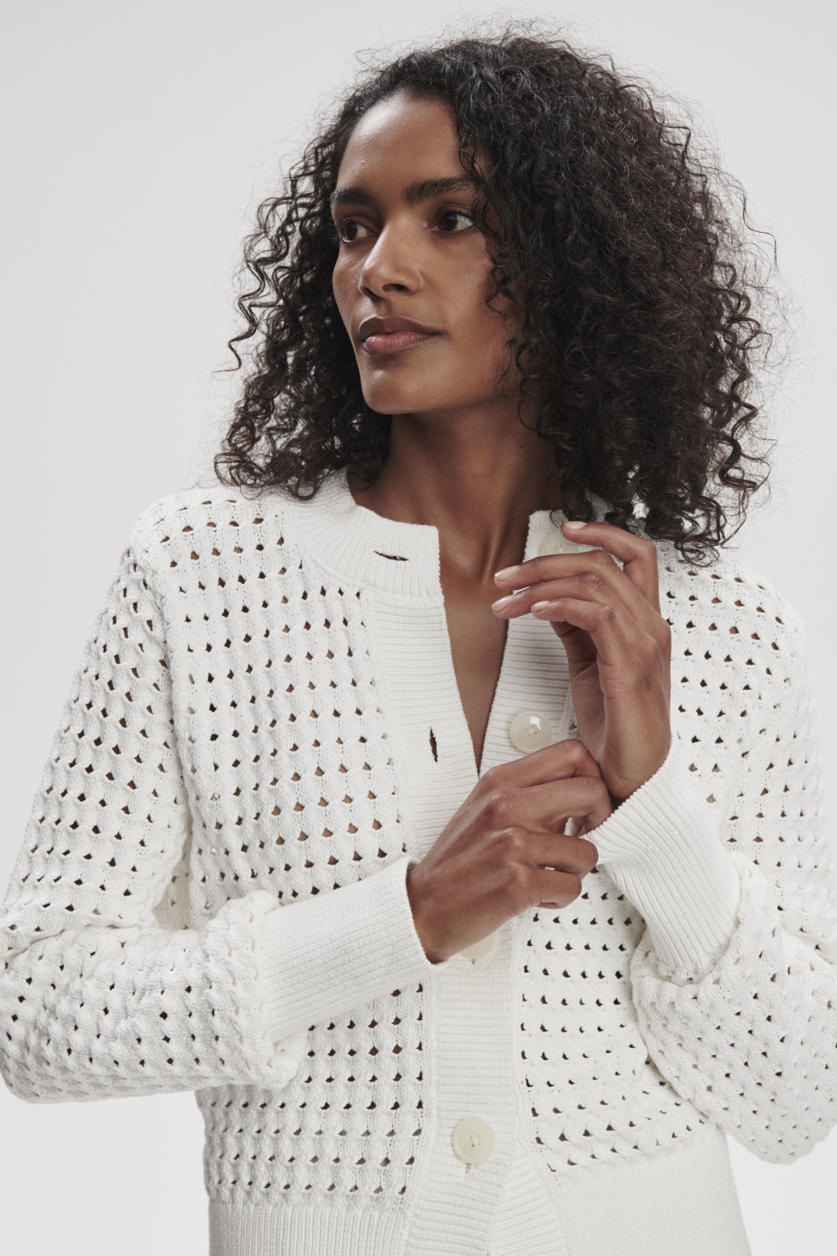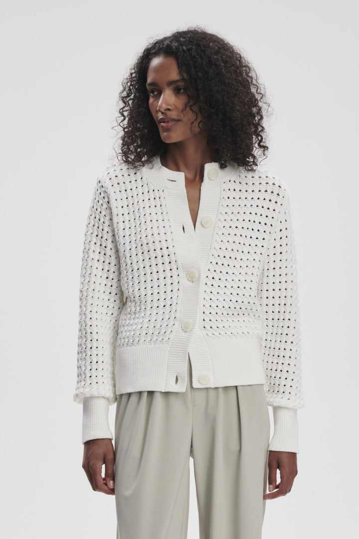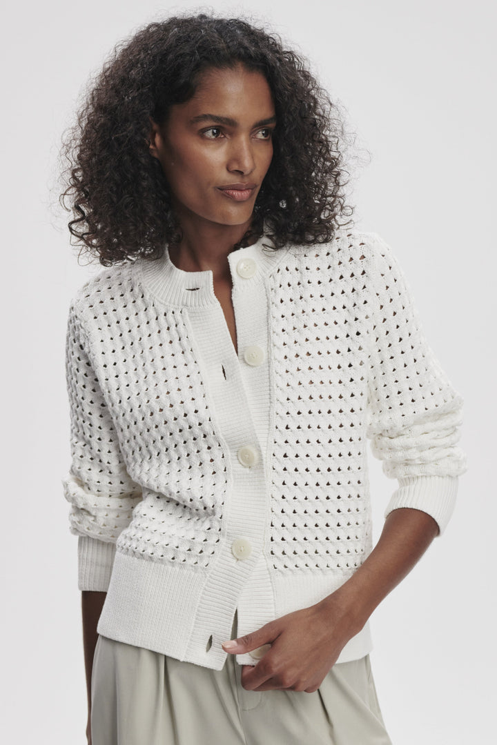 The Bettina Textured Knit Jacket in Snow White combines classic block styling with sophisticated detailing. Meticulously crafted from cotton-poly tube yarn, this button-through design features an intricate twist cable stitch pattern complemented by open pointelle layers that create exceptional dimensional texture. The result is a refined, versatile piece that maintains the timeless silhouette of the Eloise collection while offering distinctive character.