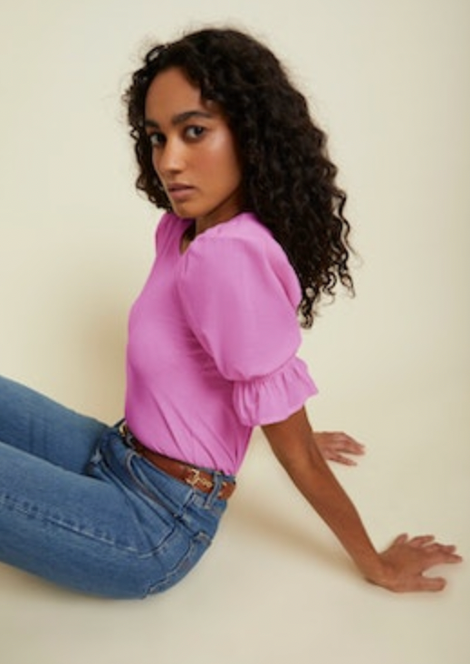 The easiest way to take your day outfit to night! This elevated tee is made of a comfortable slub cotton thru the body and is contrasted by the semi sheer voile for the billowy sleeves. Pair this tee with any denim styles! Just change up your jewelry and shoes for a fun date night look.