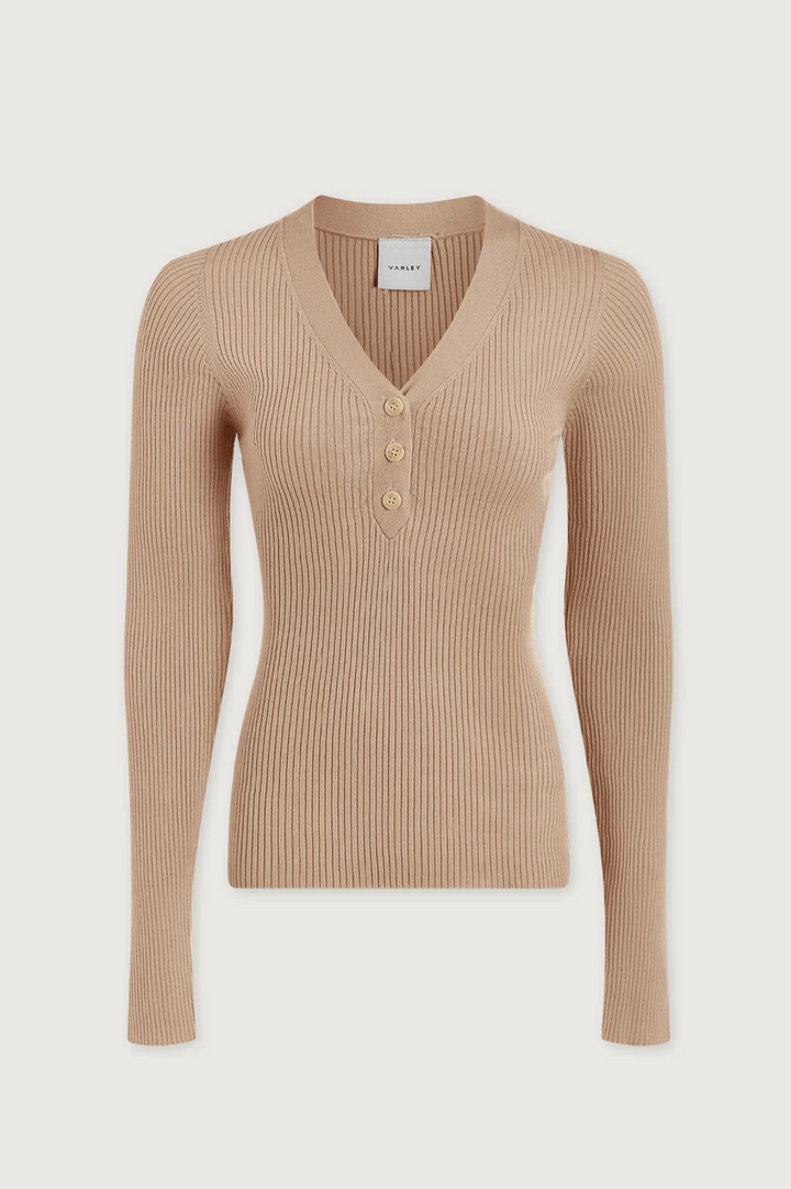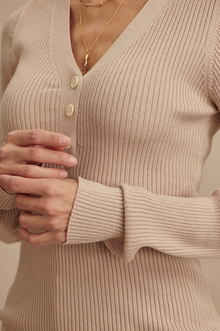 The Blanca V-Neck Rib Knit Top in Cement is your new go-to for layering or shining solo. Crafted from silky soft viscose yarn with a delicate fine-gauge stitch, it feels like a gentle hug all day long. Its slim fit and playful V-neck with button-front detail keep things effortlessly chic—whether peeking out from under a gilet or stealing the spotlight on its own!