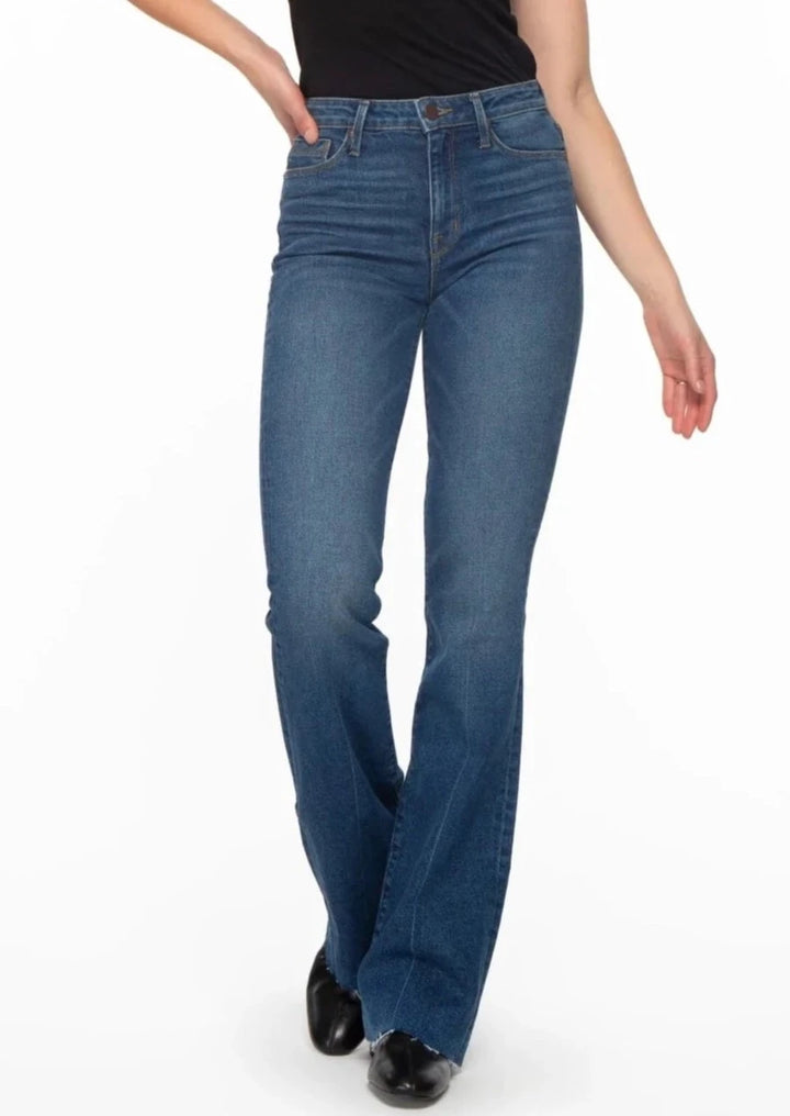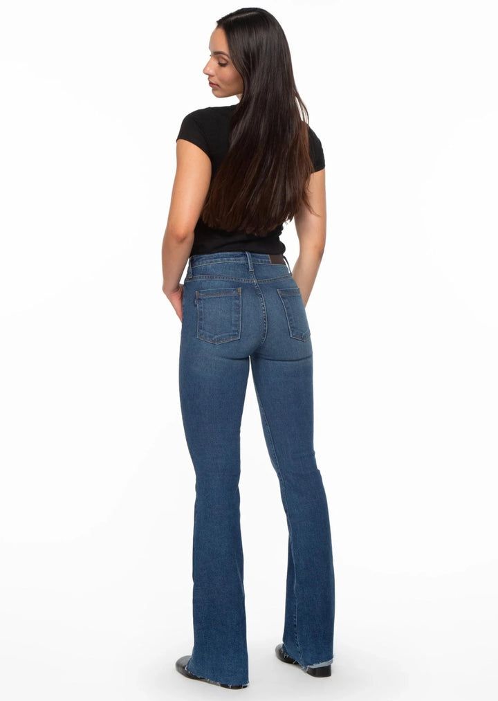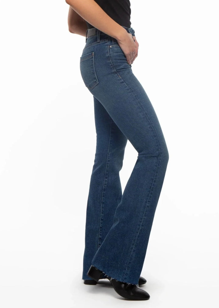 The Bombshell Bell- La Jolla offers a 4-way stretch Japanese denim fabric that provides ultra-softness and a body sculpting fit. The high-rise cut gives an elongating and slimming silhouette, while the raw hemline allows for easy length adjustments. Handcrafted in LA, this is the perfect combination of comfort and style for any wardrobe.