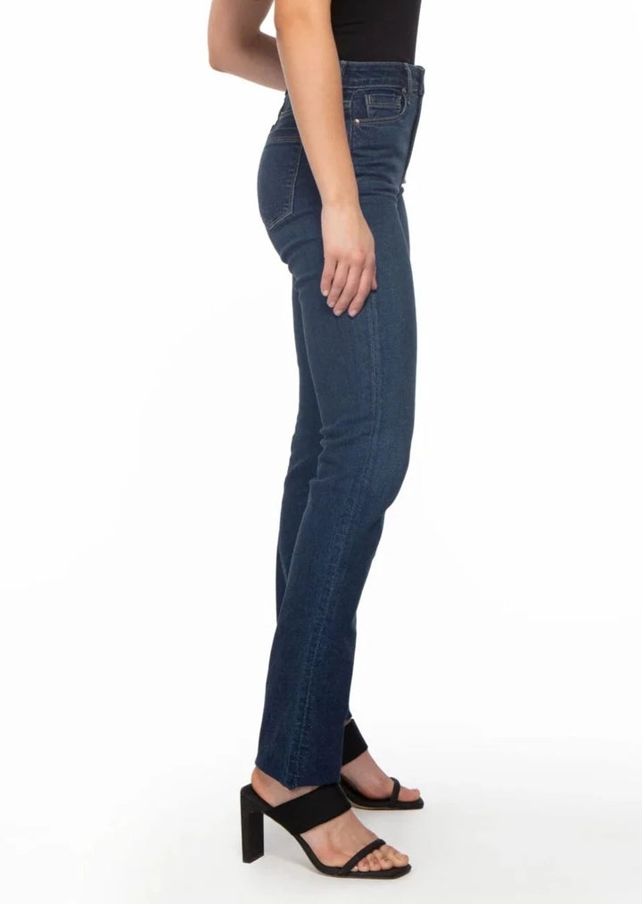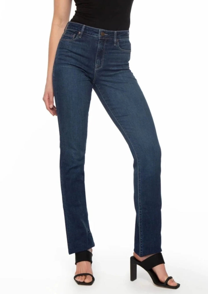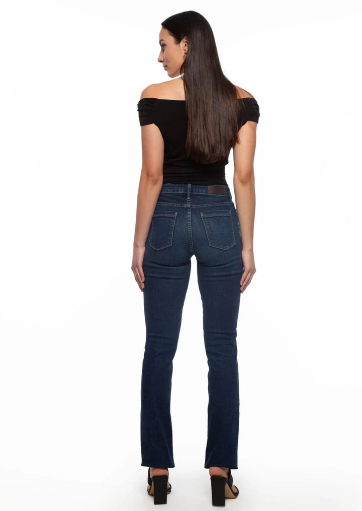 Experience effortless style and comfort with Bombshell Straight - Blue Steel. Made of the softest Japanese fabric, this high-rise denim features a figure-flattering design and a timeless straight leg style. With the perfect amount of stretch, this medium/dark rinse jean is a must-have for any wardrobe.