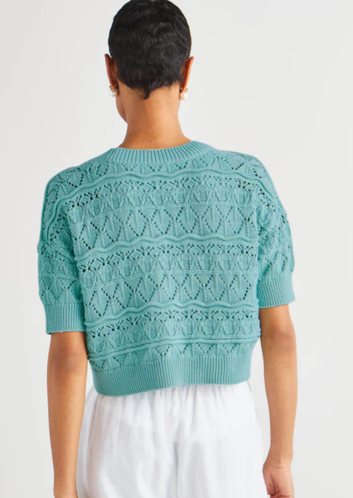 This cropped cardigan is made from 100% cotton for a lightweight knit that can be donned during sunnier seasons. A lovely pointelle stitch pattern paired with a cropped fit makes it the perfect summer topper especially over all things high waisted.