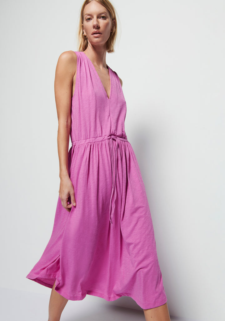Channel your inner garden goddess with the Brianna Dress in Rosebud. Made from lightweight cotton, this midi dress features a flattering v-neckline and drawcord waist for a personalized fit. The delicate pin tuck detailing adds a touch of elegance, making this dress the perfect choice for any summer occasion - from brunch to date night. And with its soft blush pink hue, you'll be radiating effortless style and charm.