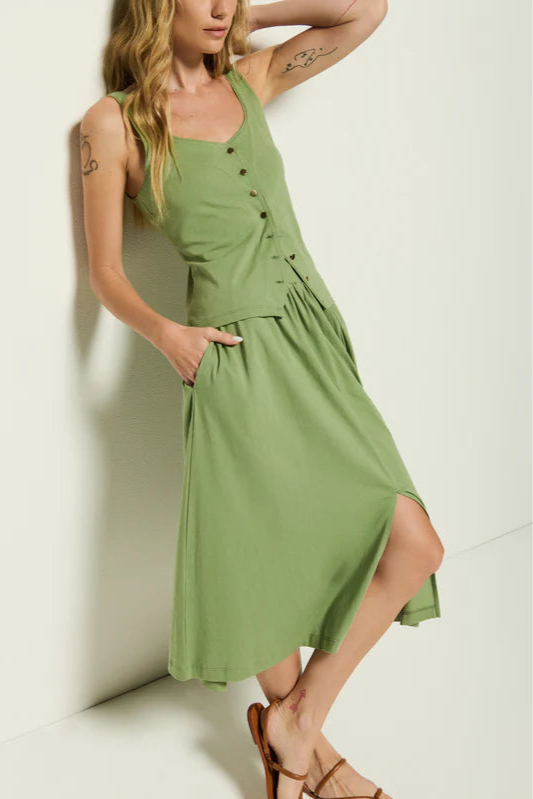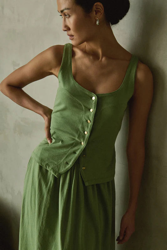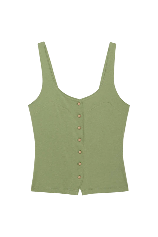 The Brya Tank Top in Loden is made from organic cotton and features a fitted bodice with front stitch detailing. The bra-friendly scoop neckline and signature gold shank-button closure add luxurious touches. Made with mindfulness and style in mind.