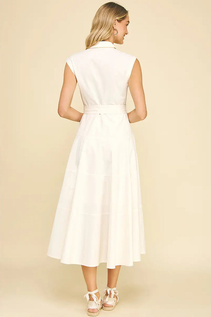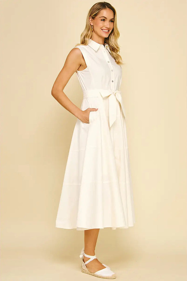 This sleeveless maxi dress features a classic button-down front and a basic collar for a timeless look. Designed with a self-tie waist to enhance your silhouette, it also includes convenient side pockets for practicality. Crafted in a clean milk white shade, this dress combines effortless style with functional details, making it a versatile addition to your wardrobe.