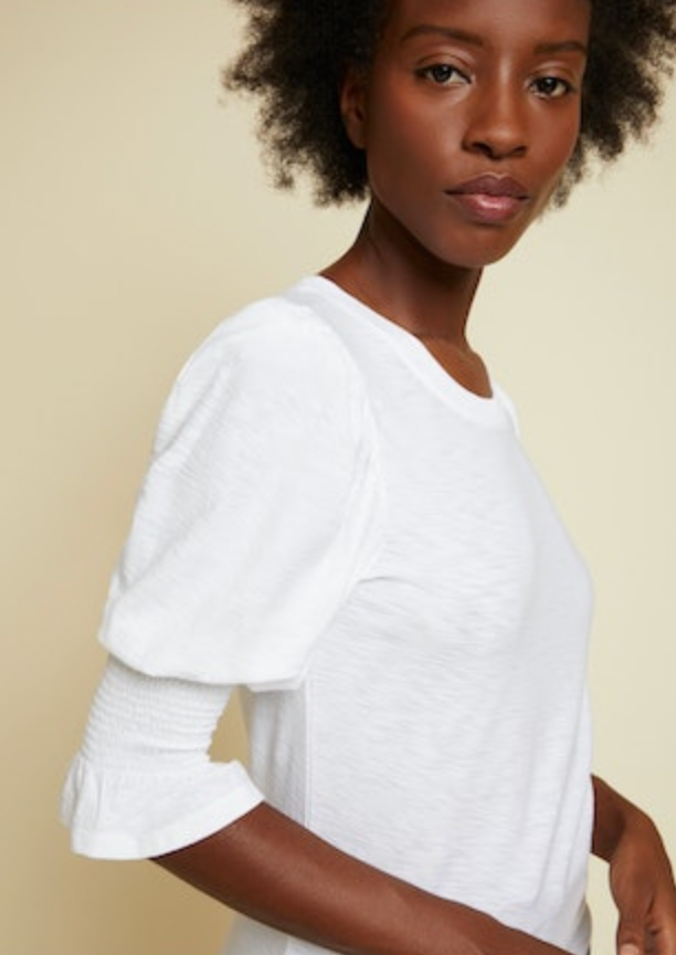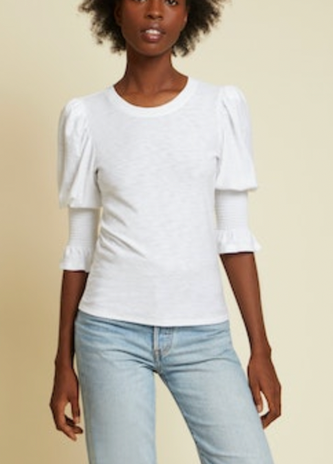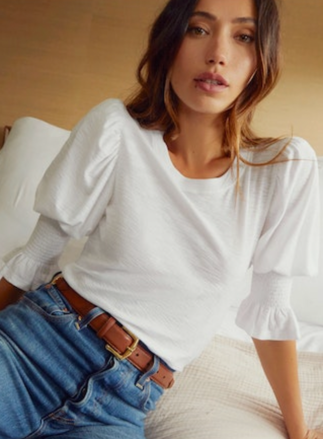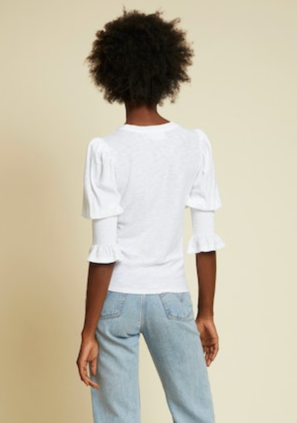 A smocked, puffed, and fluttered Renaissance 3/4 length sleeve adds exactly the right amount of drama to this everyday essential. Made of the softest reverse slub cotton, this tee will take you from day to night. We love the crisp white color, it pairs well with all denim shades.
