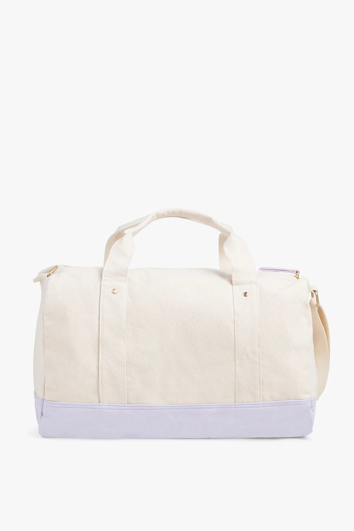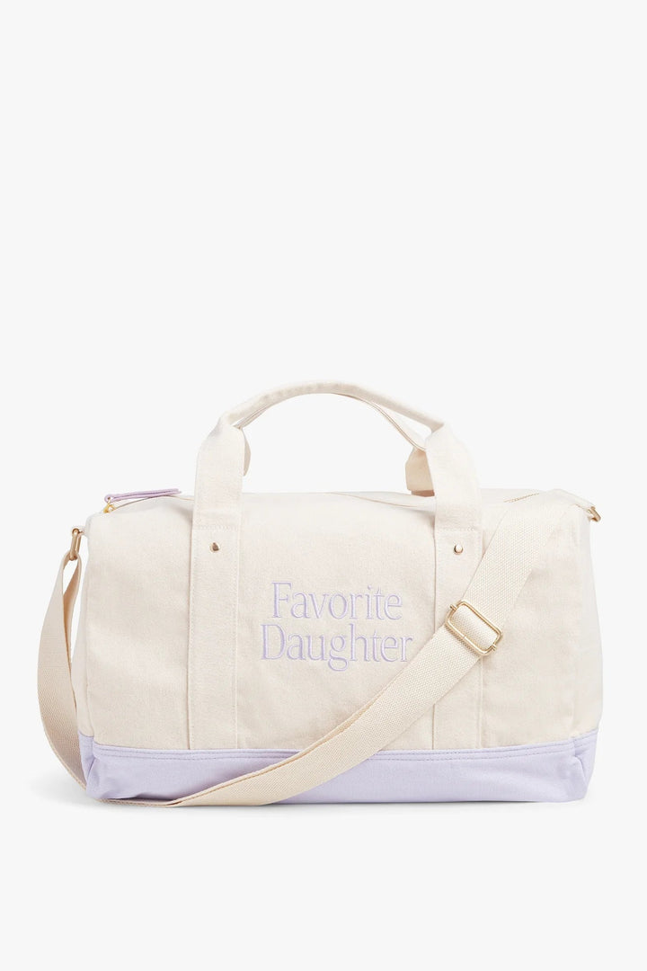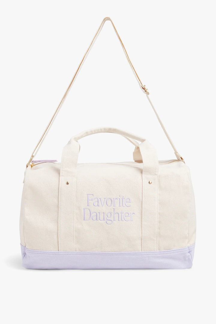 Introducing this durable cotton canvas weekend bag, designed for comfort with an adjustable strap and featuring a classic lavender base. Show off your family pride with the Favorite Daughter logo, making it your perfect companion for any occasion. Pack your essentials and head off for a weekend adventure.