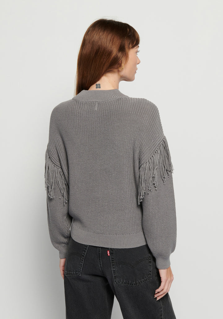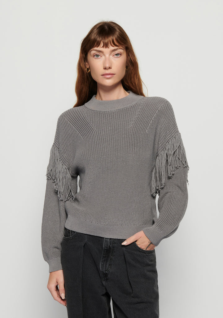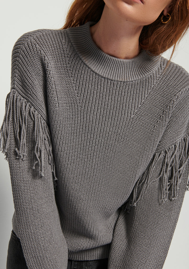 Be in style and stay comfortable with the Carine Fringed Sweater- Smoke. The mock neck and drop shoulder design is perfect whether you're dressing up or down. Featuring fringe detailing on the sleeves this charcoal grey hue will keep you looking fashionable all season. Get ready to turn some heads!