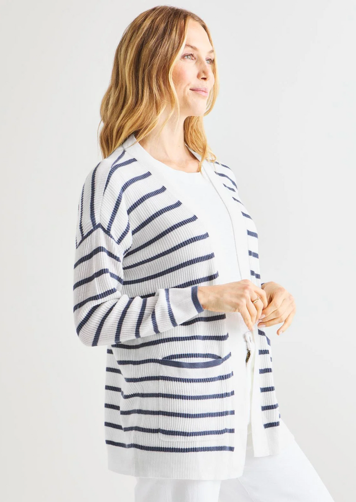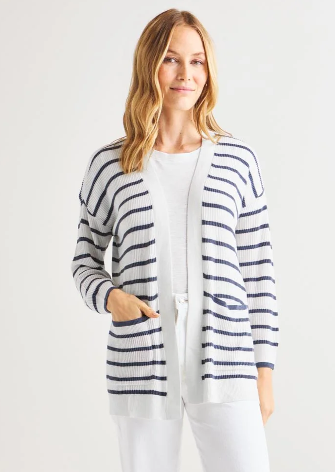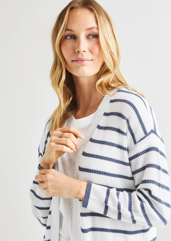 Stay stylish and cozy this summer with our Cashblend Luna Stripe Cardigan in classic cerulean and white. Lightweight and soft with a touch of cashmere, this long-length open front design is ribbed throughout for added texture. The perfect addition to any summer outfit!