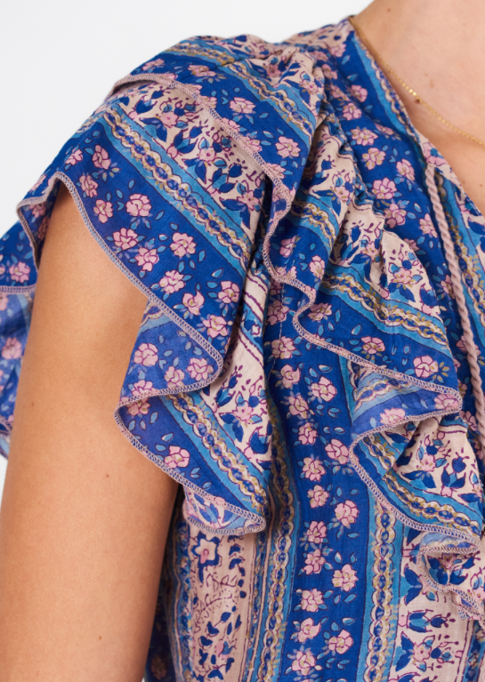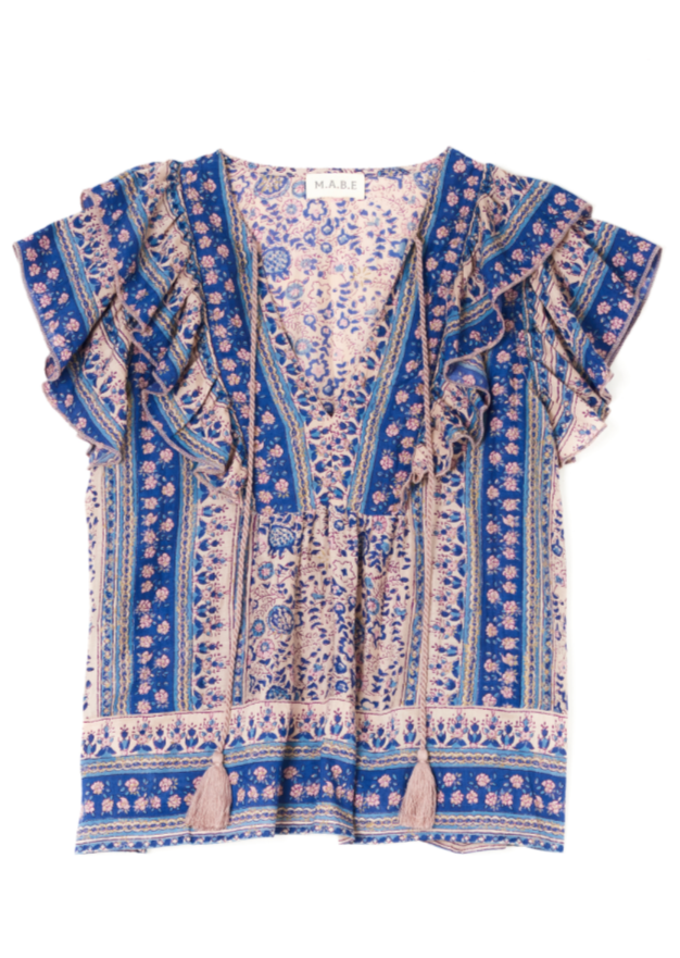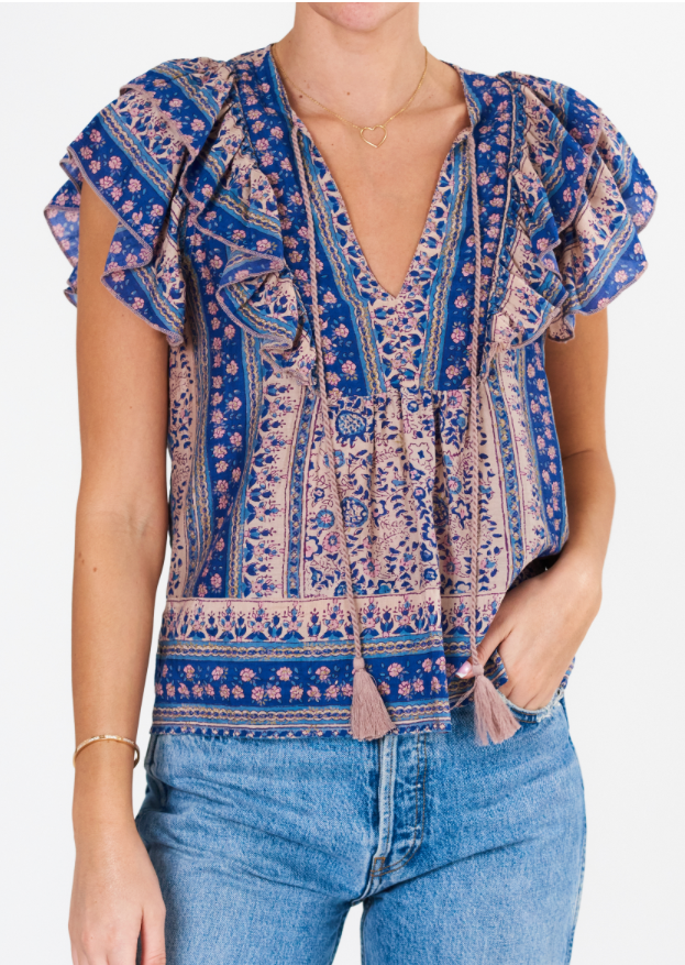 Introducing the Cass Print Short Sleeve Top, featuring a gorgeous floral print, tassle tie details, and ruffle shoulder for a playful touch. The lightweight fabric and split neckline ensure comfort and style in this one-of-a-kind blouse. Perfect for adding a pop of color to any outfit. Pair with the matching skirt or any of your favorite jeans
