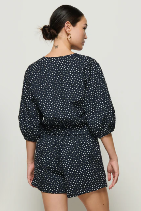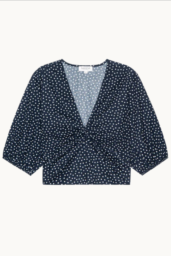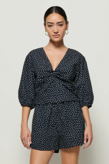 Achieve a polished look effortlessly with the Celeste Top in Cabana Polka Dot. The ruched twist detail at the bust, 3/4 balloon sleeves, and daring v-neckline add a touch of elegance to your ensemble. Perfect for when you want to look put-together without the extra effort.
