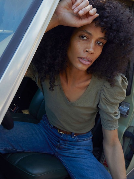 Cotton V-neck puff sleeve tee with smocked detailing at elbow.