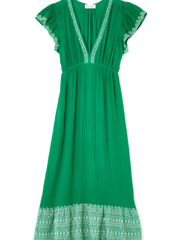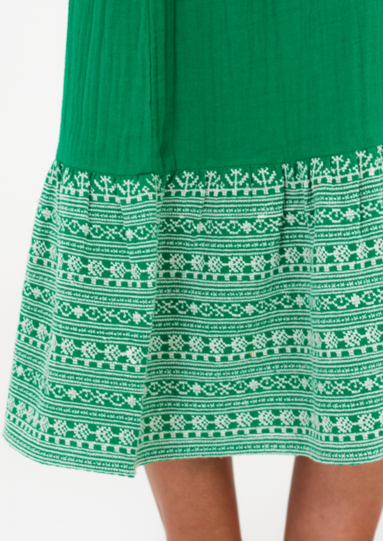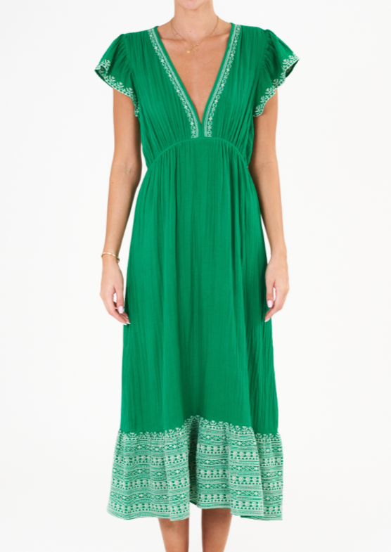 Bring some fun and whimsy to your wardrobe with the Cella Embroidered Dress in a bright warm green hue. Made from embroidered cotton, this midi dress features a flattering deep v front and elasticated waistband for a comfortable yet elegant fit. The flutter sleeves add a playful touch, making it the perfect choice for any occasion. Simple yet timeless, this dress is a must-have addition to your collection!