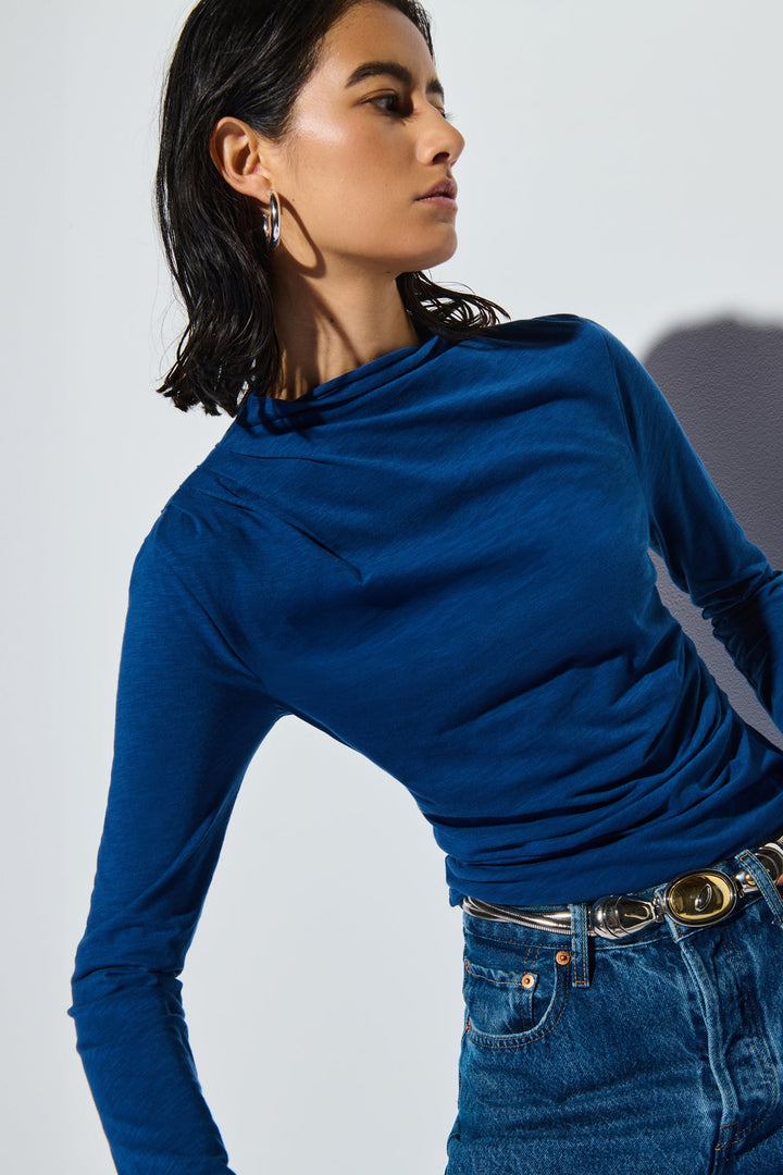 Effortlessly transition from day to night in our Charlotte Asymmetrical Top. The mock neck and draping create a universally flattering silhouette. Stay stylishly cool in this long sleeve tee with modern details.