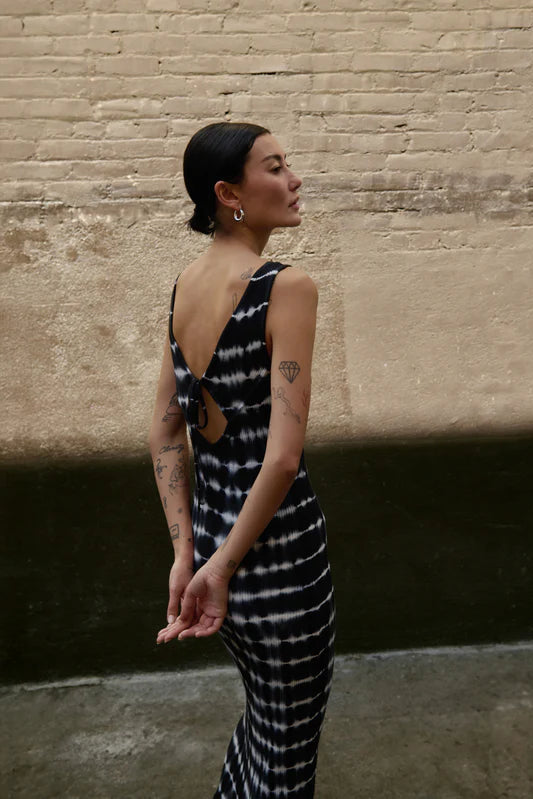 Elevate your summer wardrobe with our Christy Tie Dye Dress in Tie Dye Stripe. Crafted from ribbed cotton, this dress boasts a polished silhouette and a bra-friendly boat neckline. The cut-out backing with a simple tie closure adds a touch of effortless elegance to this classic piece. Perfect for any occasion.