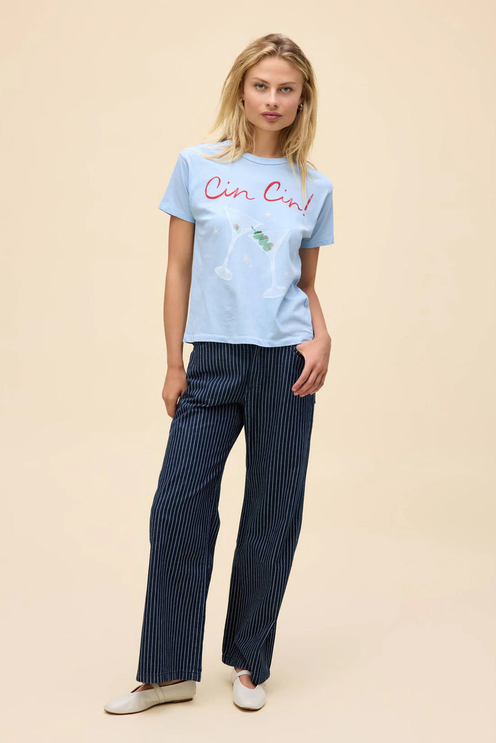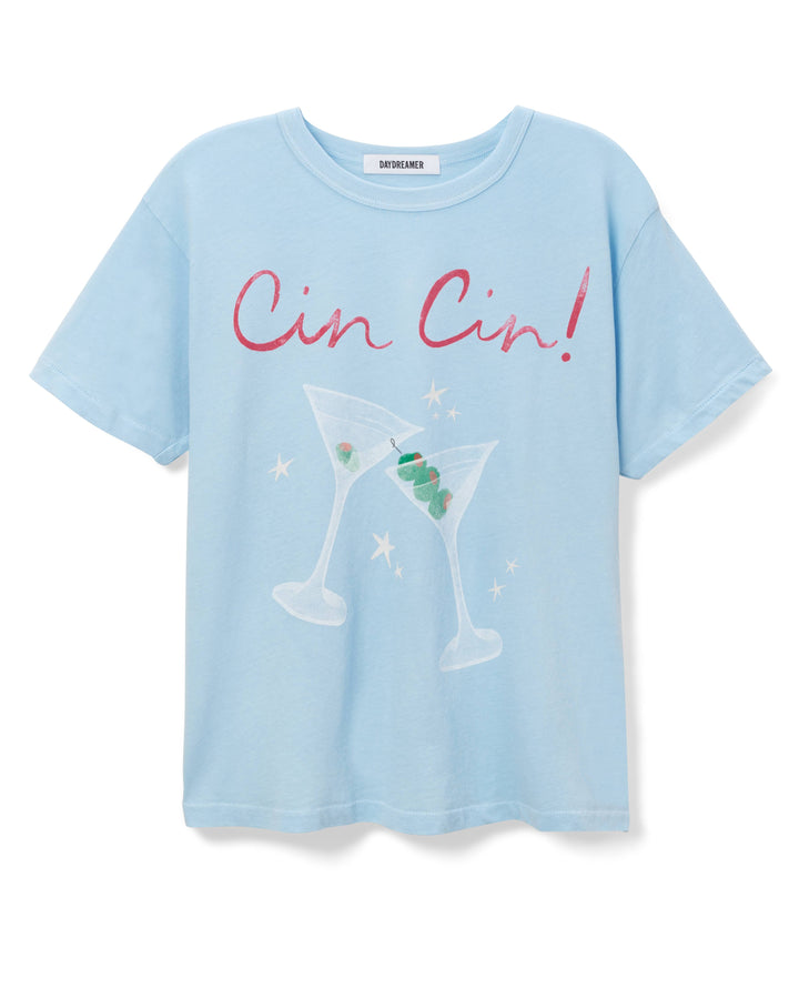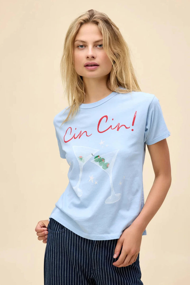 Toast to style with our Cin Cin Ringer Tee in Powder Blue. Made with midweight cotton for a classic fit, this tee features a playful ringer neckline and a vintage look and feel. Perfect for adding a touch of festiveness to your wardrobe. Cheers to that!