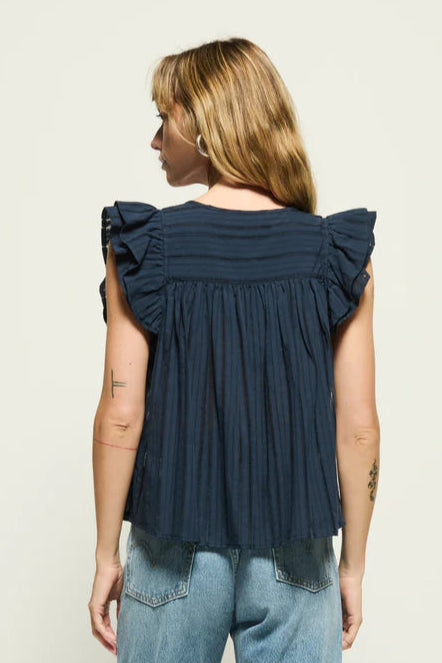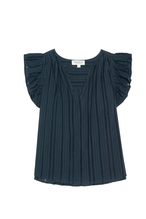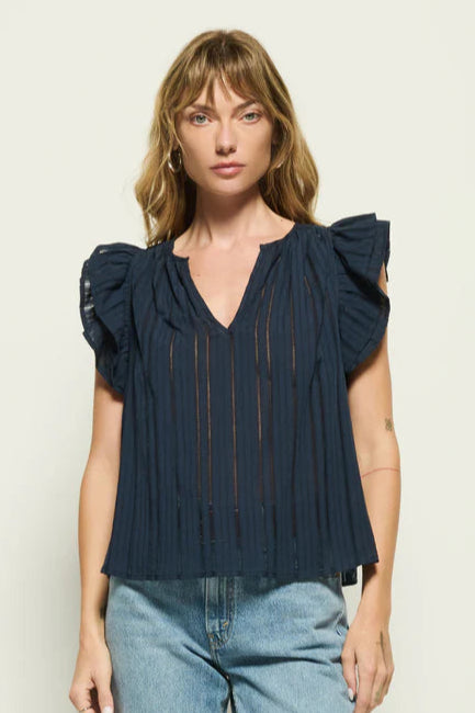 Expertly crafted with a double flutter sleeve and structured v-neckline, the Claudia Top is a feminine staple. Its delicate gathering bodice with yoked backing creates a chic and effortless look. Made with mindful cotton and available in Navy Night Sky.