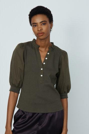 Effortlessly transition from day to night in the Clemente Mixed Media Shirt. With its henley style and split neckline, this shirt is both stylish and versatile. The feminine detailing and puff elbow length sleeve add a touch of charm to this must-have piece. Available in a rich olive green hue, this shirt is sure to become a wardrobe staple.