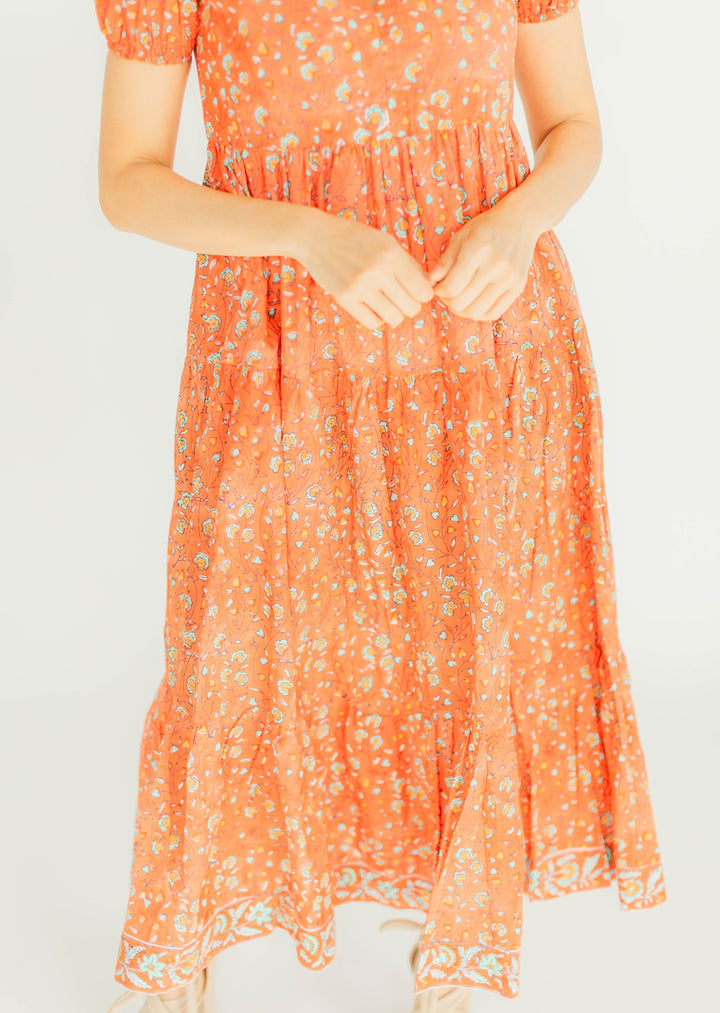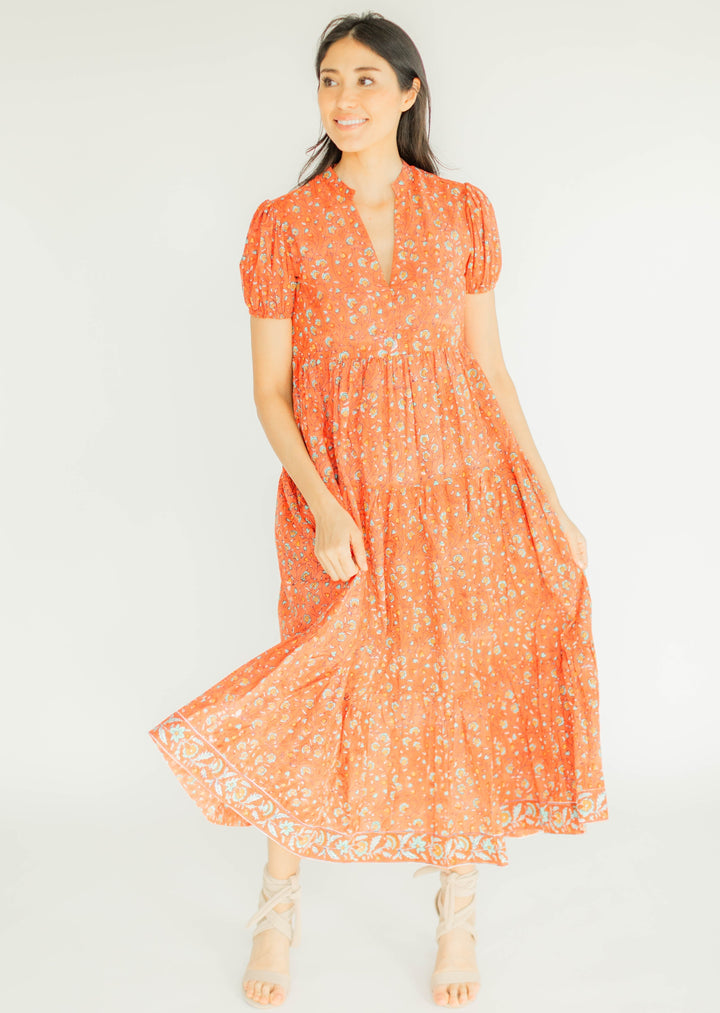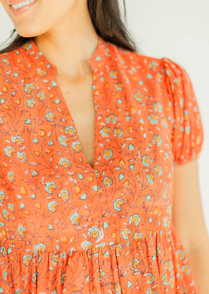 The Clover features a v-neckline, short puff sleeves and contrasting trim on the hem.