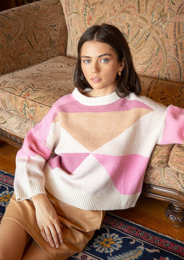 Expertly designed for a boxier fit, this Colorblock Sweater adds a touch of sophistication with its cream beige and pink hues. Made from a soft medium weight knit fabric, the geometric print adds a modern and stylish touch. Elevate your wardrobe with this statement piece.