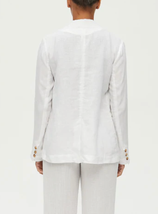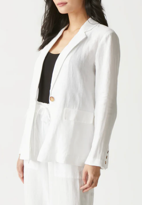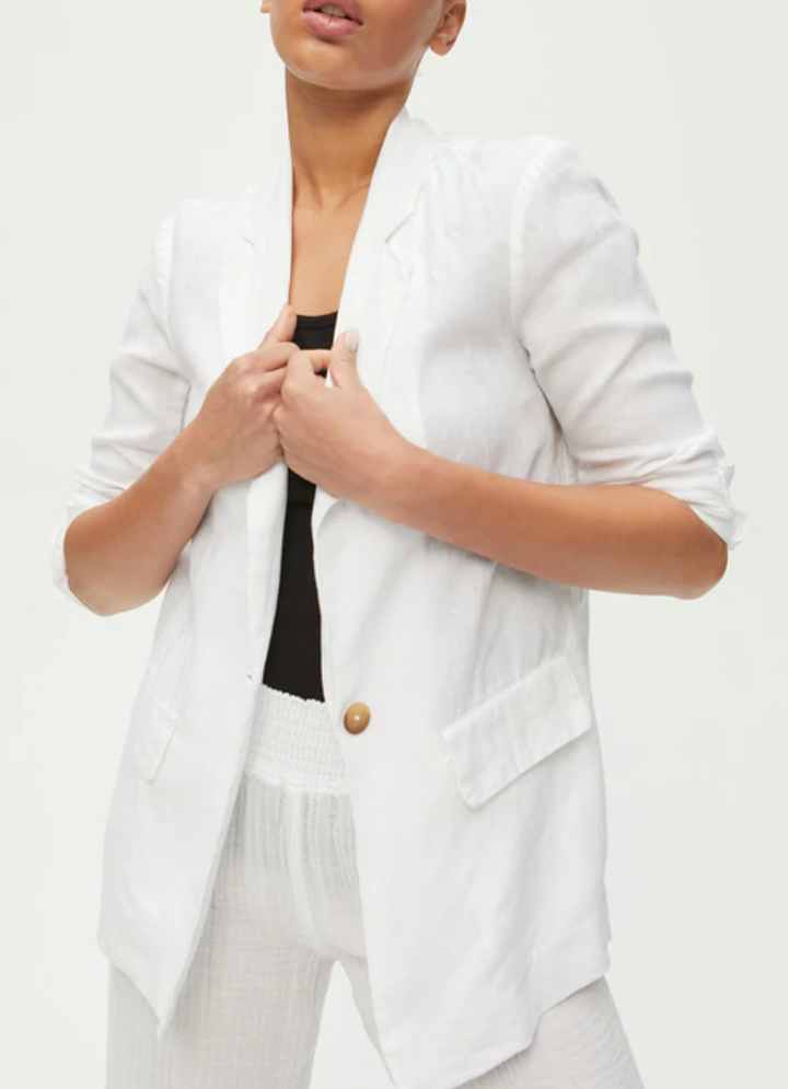 Menswear inspired linen jacket blazer. Classic long fit with front pockets and button closure. Pair with anything from denim to dresses in the warmer months.