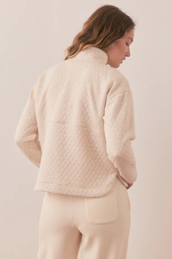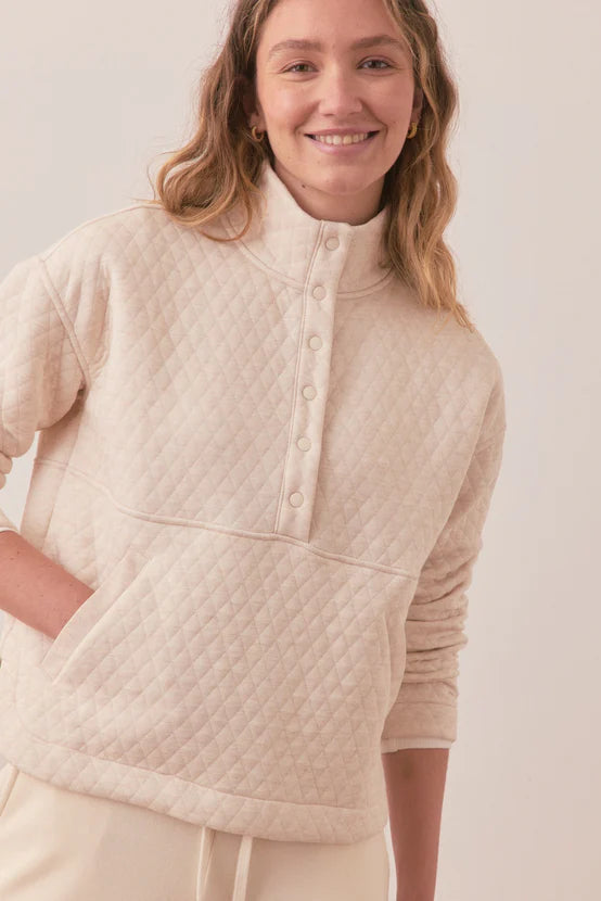 Introducing the Corbet Funnel Neck Pullover in Oatmeal - a crowd-favorite made from our signature Corbet Quilted fabric. This cozy pullover boasts a convenient kangaroo pocket, a snap placket, and a stylish curved saddle hem. Perfect for everyday activities, it's the ideal companion for dog walks, coffee runs, or just lounging at home. Easy to pair with leggings or jeans, this will be your new go-to piece.