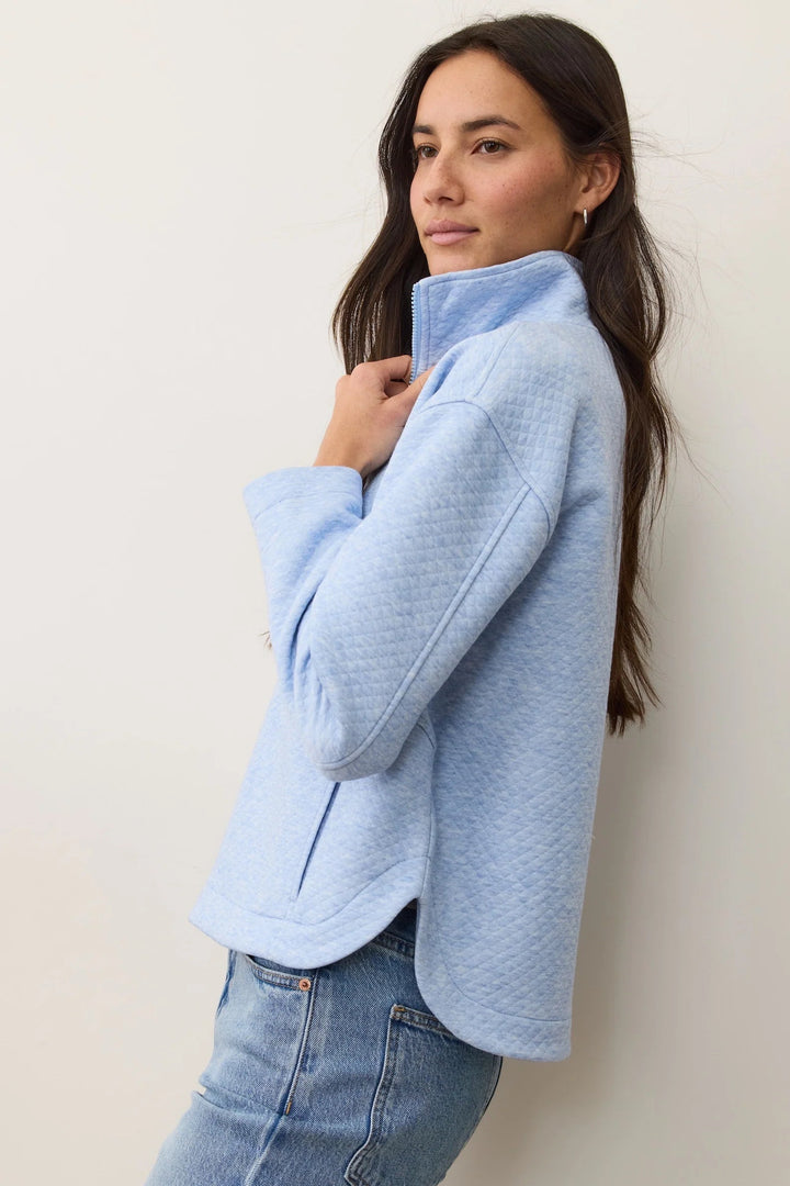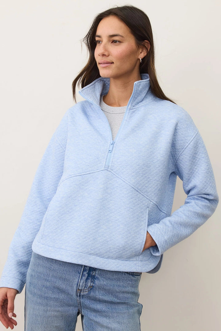 Meet your new favorite layering piece—the Corbet Quilted Half Zip. It's got all the cozy comfort of a hoodie with a polished edge that actually looks intentional. The innovative mini diamond quilting keeps things warm while delivering a sportier aesthetic, so you can go from lounging to looking effortlessly put-together. Crafted from 80% recycled polyester and 20% TENCEL™ lyocell, this relaxed-fit essential features a high mock neck, hidden kangaroo pocket, and hits right at the high hip. Sustainability meets style in one seriously versatile piece.