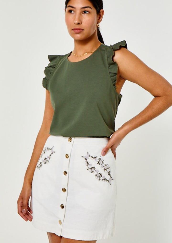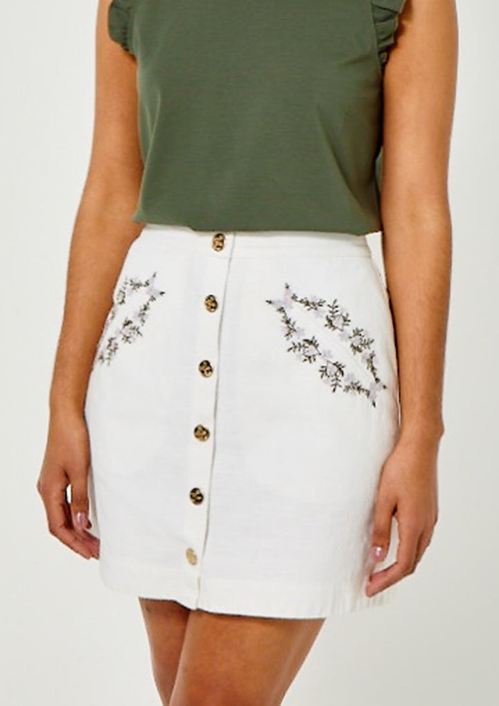 Turn heads with the Cosette Skirt! This sophisticated and unique a-line mini is lightly lined and features back elastic at the waistband. The embroidered flower detailing at the pockets and custom gold button front add a classic touch. Dress it up or down for any occasion!