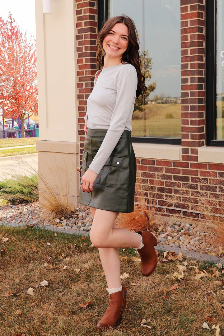 Damia Vegan Leather Skirt—Dark Green Khaki