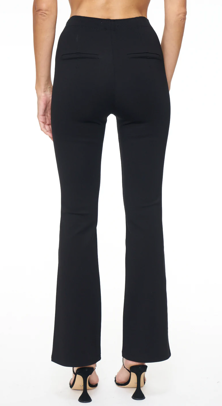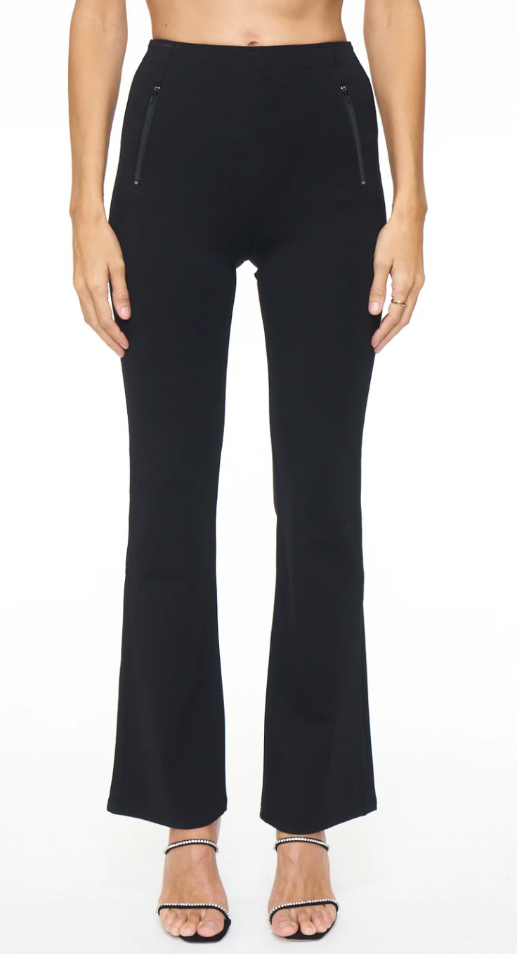 High rise flare dress pant with front zipper pocket details. Pull on style, fitted from waist to knee and flares out at ankle. Super stretchy medium weight Ponte fabric. 12" front rise, 32" inseam, 19" leg opening.