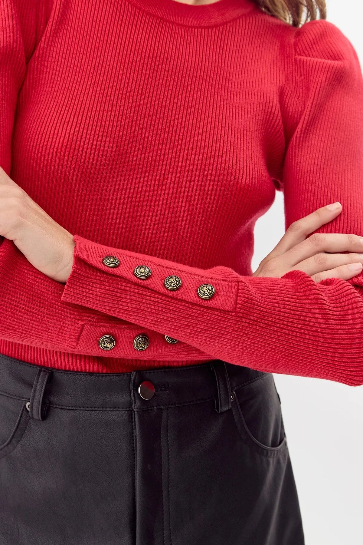 Puff sleeve, knitted sweater with gold button accents on the sleeve. The perfect red for the holiday season! Pair with your favorite jeans or dress up with a skirt for all your holiday parties! True to size.