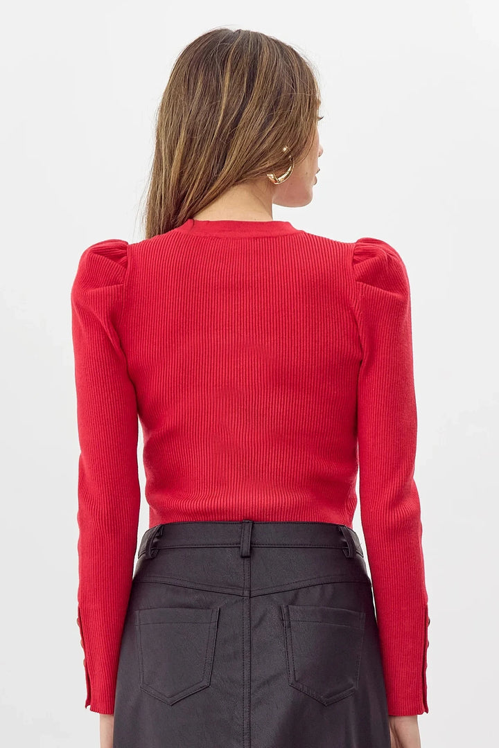 Dani Button Puff Sleeve Ribbed Knit Top—Red