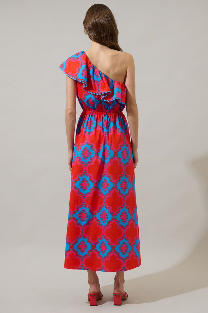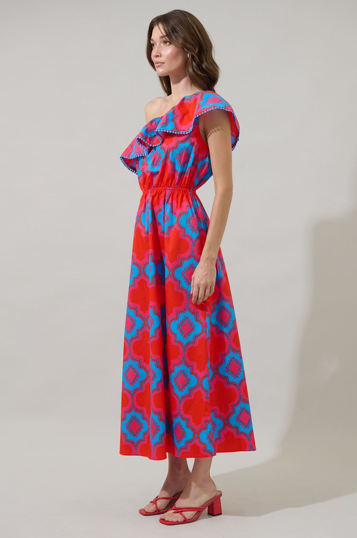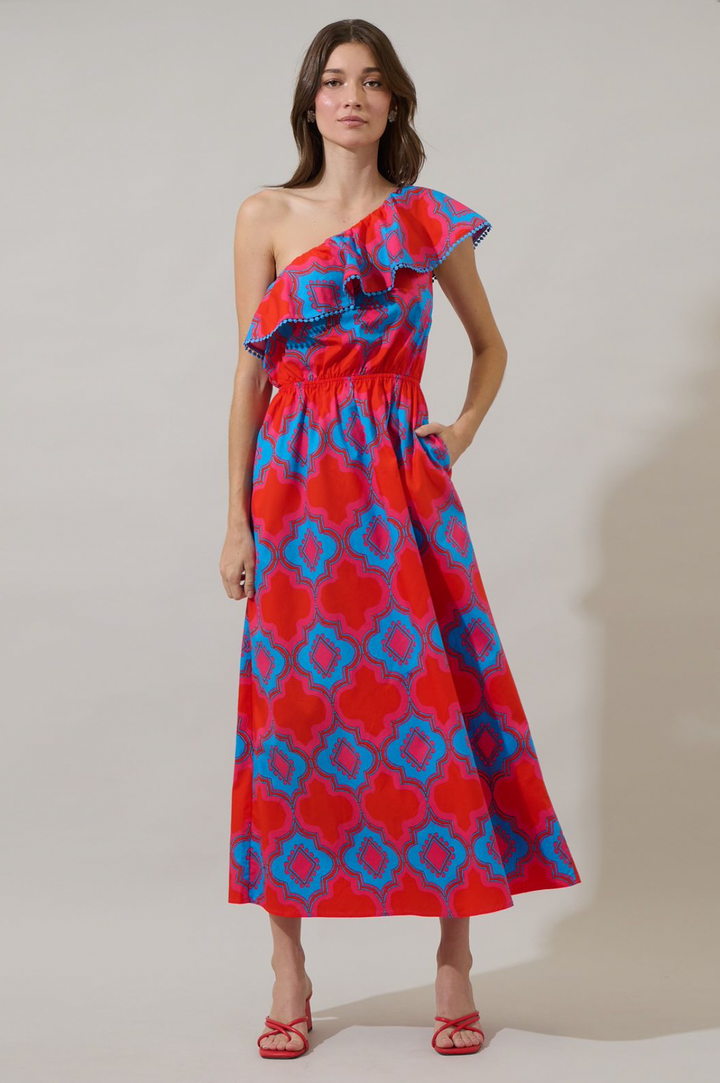Devany One Shoulder Ruffle Dress- Red/Blue **Final Sale**