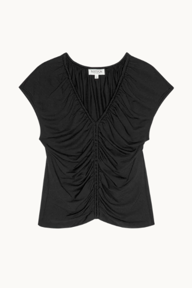 Elevate your everyday look with the Dona V-Neck Top in Jet Black. Crafted from ultra-soft Luxe Jersey Spandex, this ruched tee hugs you just right while keeping things effortlessly comfy. Its flattering V-neck adds a touch of playful charm, making it the perfect go-to for layering or wearing solo—get ready to reach for it again and again!
